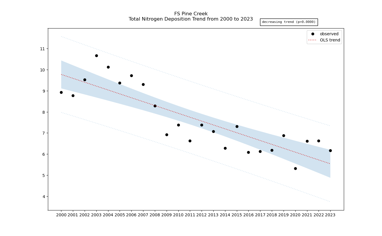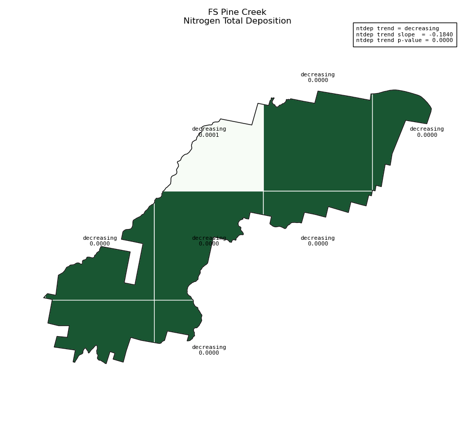Annual averages for nitrogen total deposition are calculated by clipping the gridded ntdep data to the wilderness boundary, multiplying the total deposition value for each grid cell by its area inside the wilderness, summing ntdep for all cells, then dividing that sum by the total area of the wilderness. These annual averages are then used to determine nitrogen deposition trend inside the wilderness. Decreasing nitrogen deposition indicates an improvement in wilderness character.