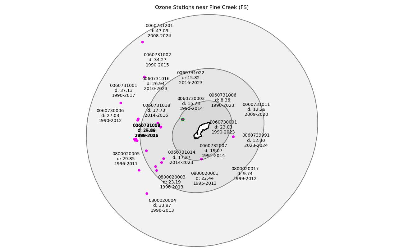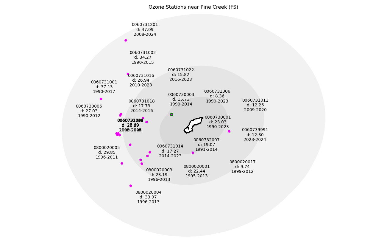 Monitoring data from sites located within 25 miles of a wilderness boundary are generally considered representative. Only ozone data from 1990 forward are considered valid for this measure, so the earliest 3-year moving average used for any wilderness should be 1992. Period of record otherwise begins at the year of wilderness designation. A wilderness designated in 2000, for example, would use data from 2000, and the first 3-year average would be from 2002. Not all ozone monitoring sites have legacy data dating from the year of designation, in which case the baseline trend uses the ozone data when monitoring began.