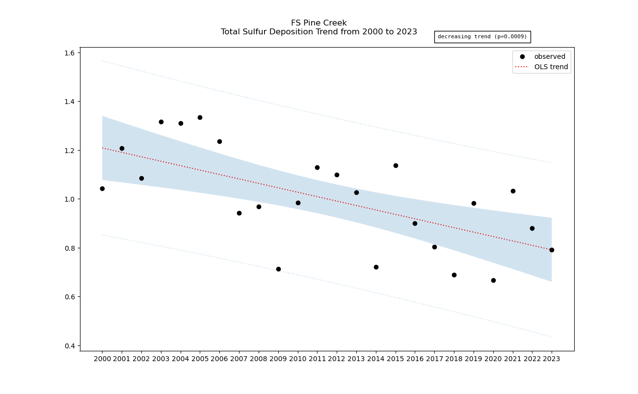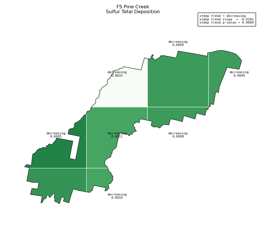 Annual averages for sulfur total deposition are calculated by clipping the gridded stdep data to the wilderness boundary, multiplying the total deposition value for each grid cell by its area inside the wilderness, summing stdep for all cells, then dividing that sum by the total area of the wilderness. These annual averages are then used to determine sulfur deposition trend inside the wilderness. Decreasing sulfur deposition indicates an improvement in wilderness character.