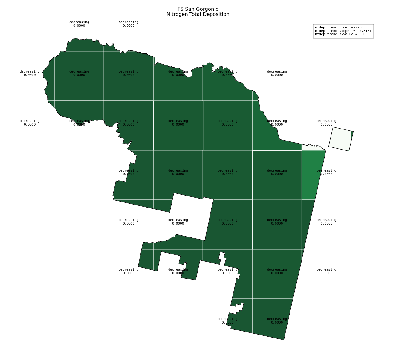 Annual averages for nitrogen total deposition are calculated by clipping the gridded ntdep data to the wilderness boundary, multiplying the total deposition value for each grid cell by its area inside the wilderness, summing ntdep for all cells, then dividing that sum by the total area of the wilderness. These annual averages are then used to determine nitrogen deposition trend inside the wilderness. Decreasing nitrogen deposition indicates an improvement in wilderness character.