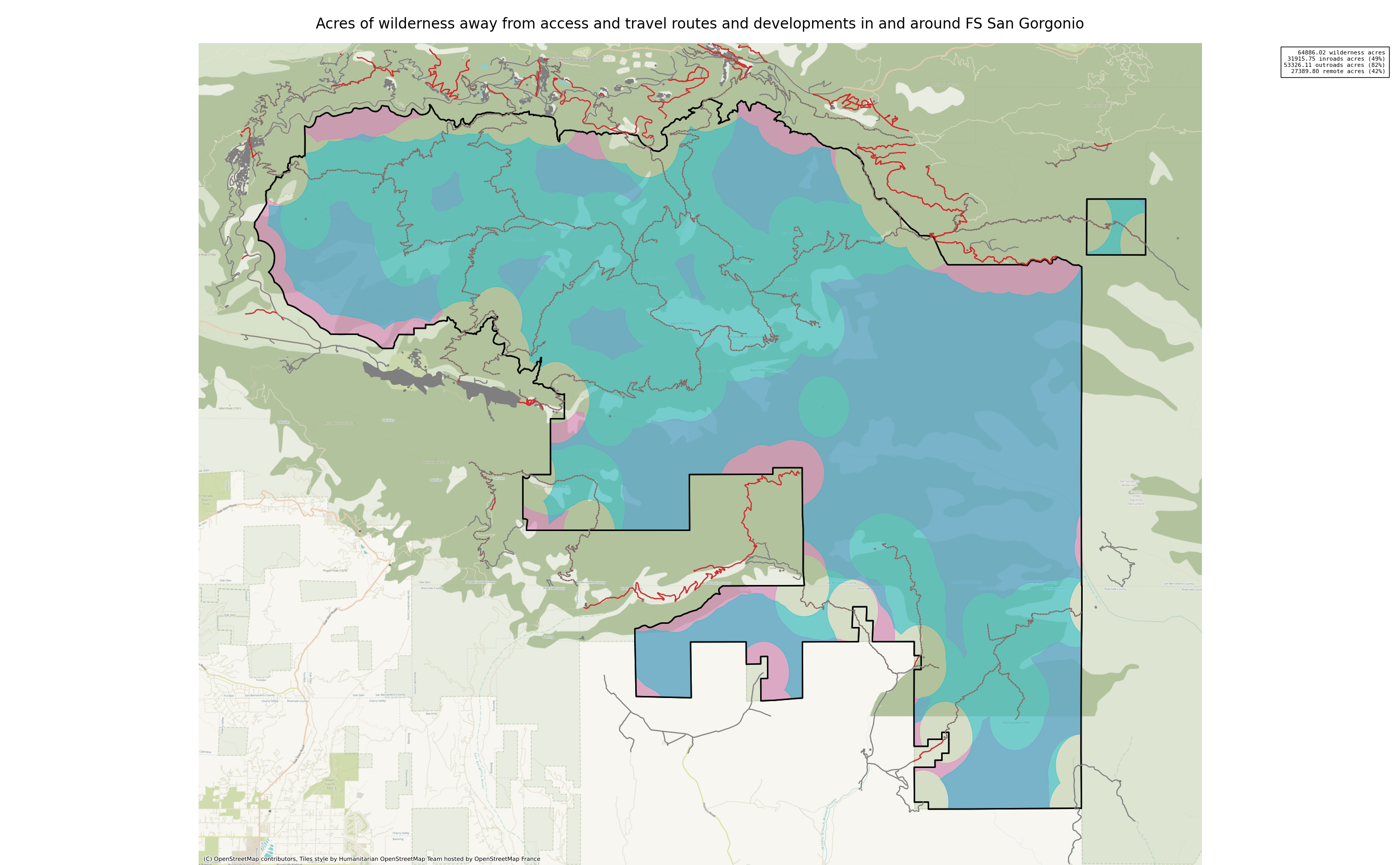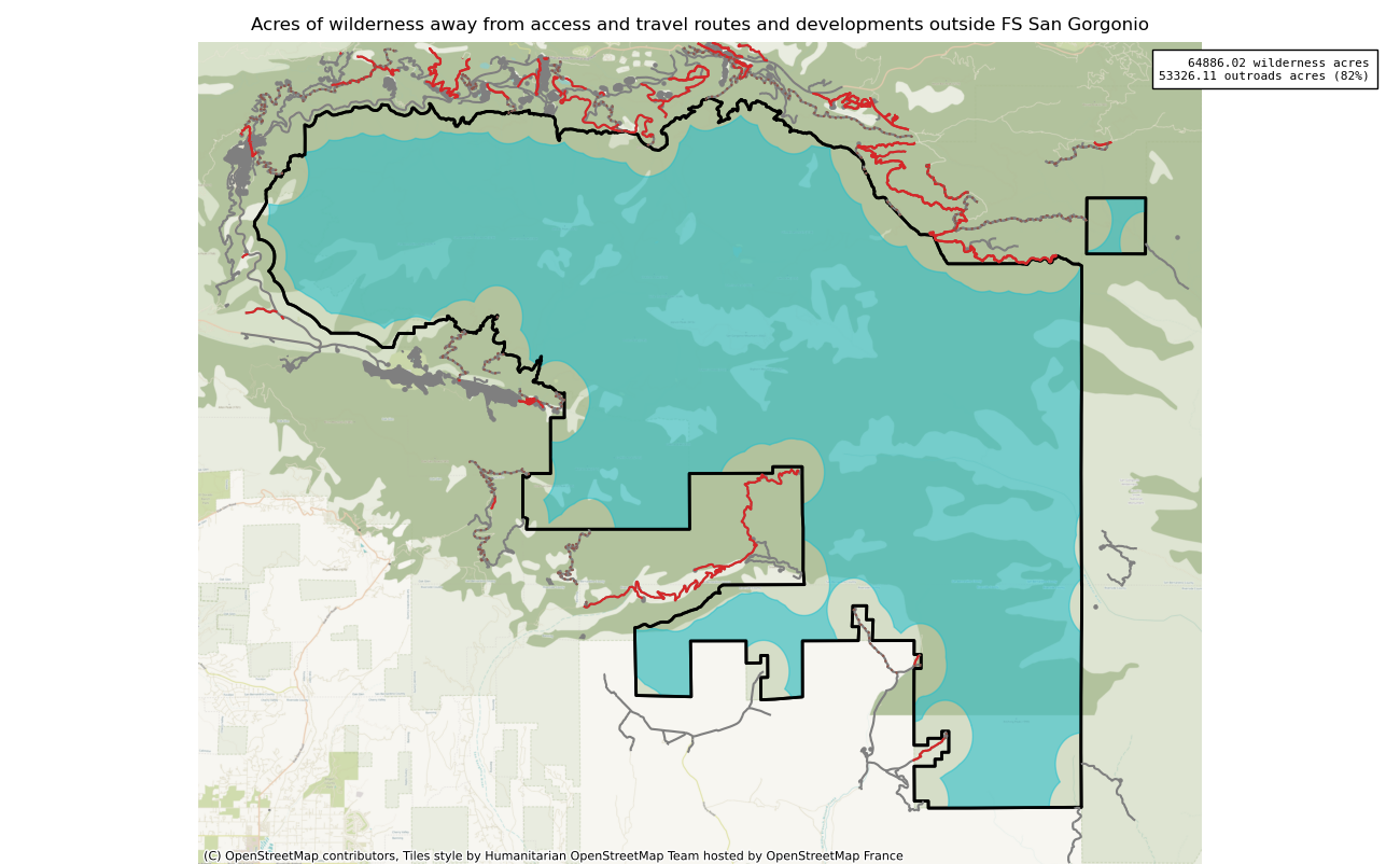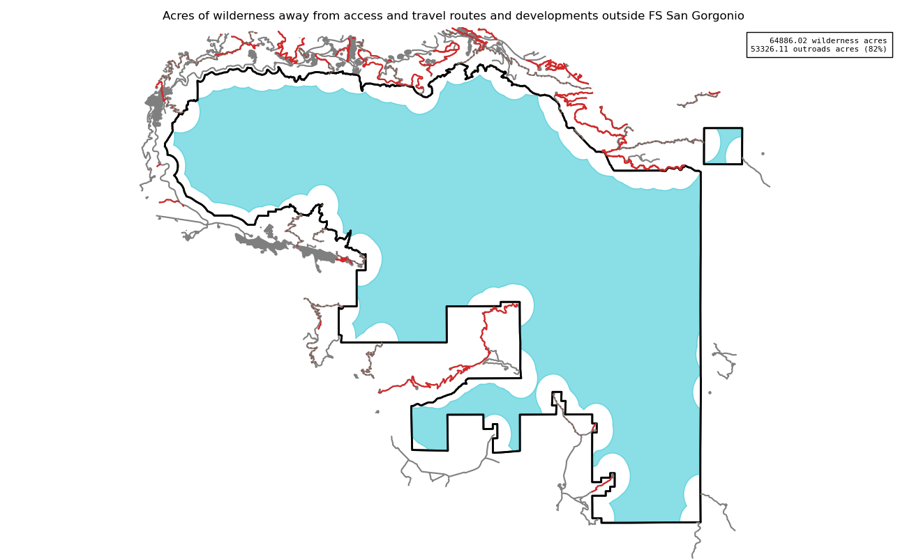 Note that roads and developments located exactly on the wilderness boundary are included in this measure. Spatial data resolution and accuracy can vary greatly across sources, and determining the intersection of a road represented by a single infinitely thin line can produce incorrect results. These should always be verified locally and corrected.