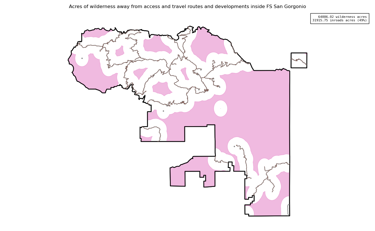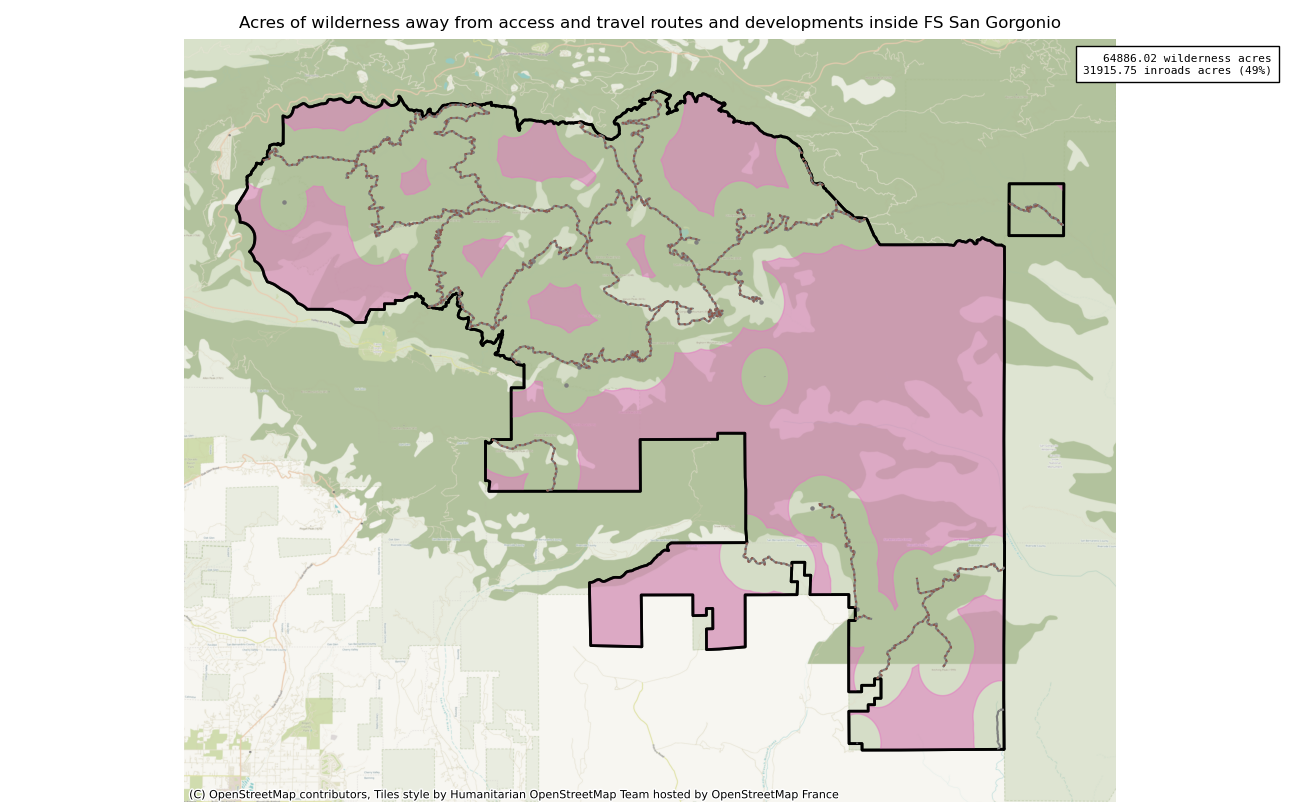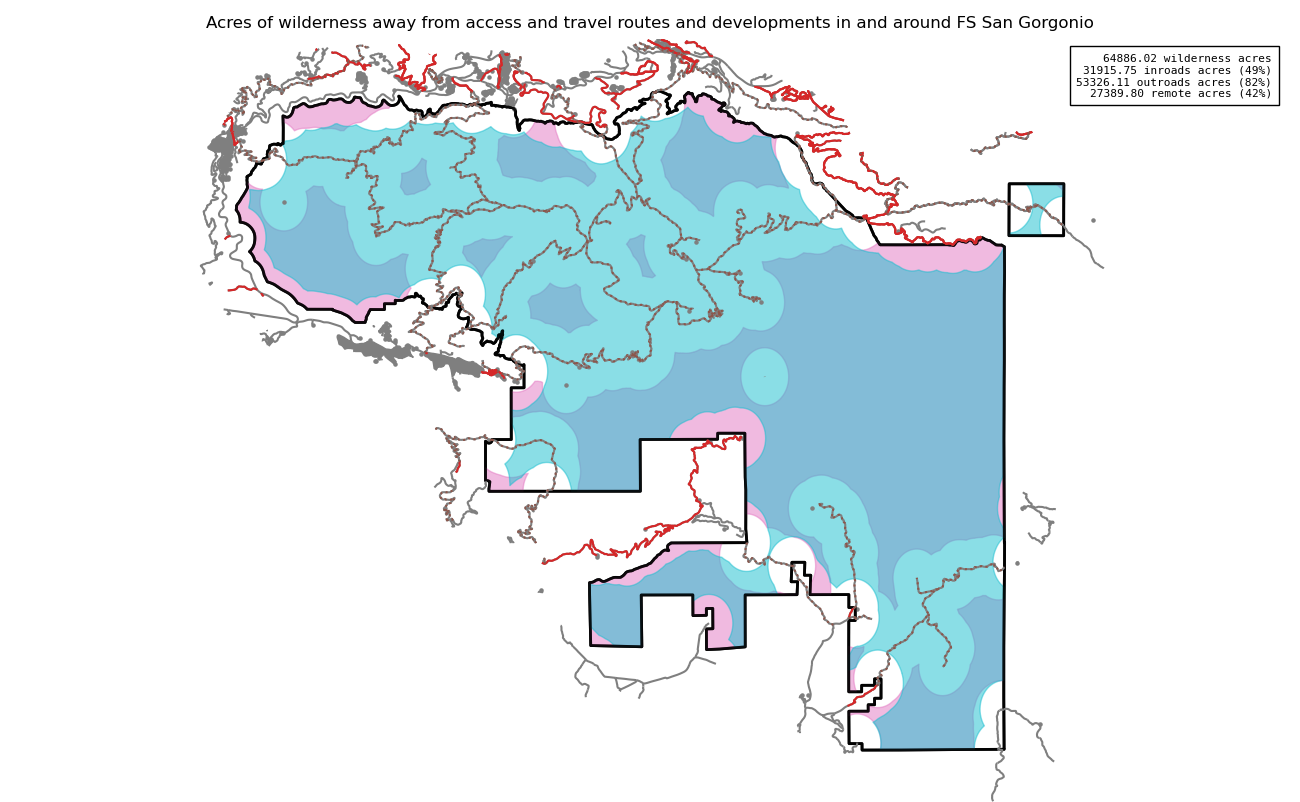 Note that roads and developments located exactly on the wilderness boundary are included in this measure. Spatial data resolution and accuracy can vary greatly across sources, and determining the intersection of a road represented by a single infinitely thin line can produce incorrect results. These should always be verified locally and corrected.