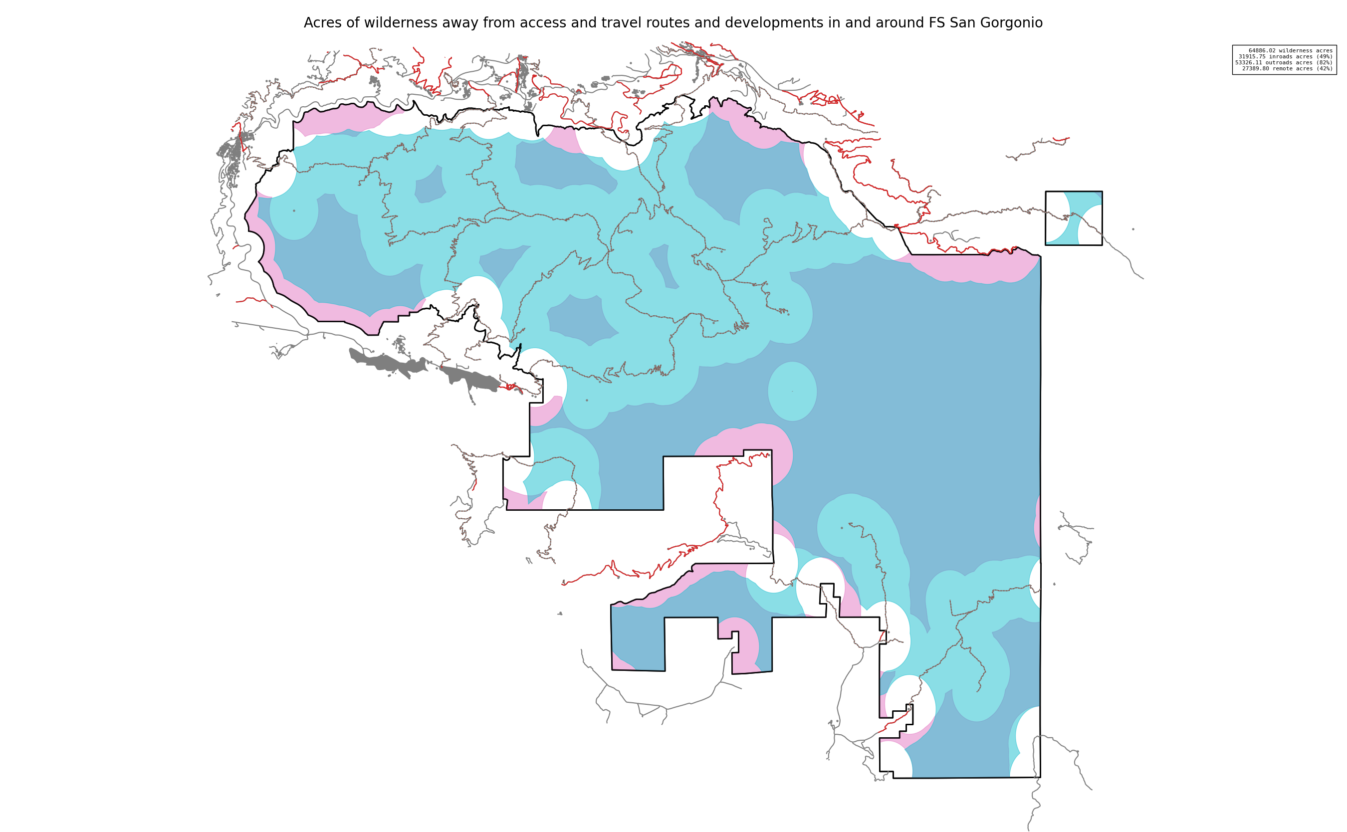 Once we have a reasonably accurate representation of developments around the wilderness, these are clipped to the wilderness boundary, buffered to half a mile, and these areas are subtracted from the total wilderness area. This initial acreage is the baseline value. The measure is recalculated using current data sources every five years to determine a trend.