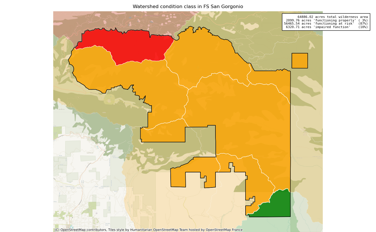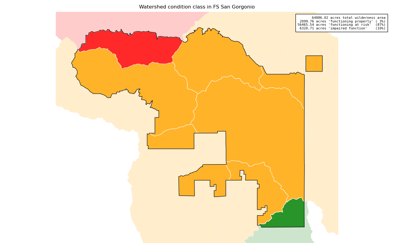 The Watershed Condition Class measure is intended to monitor changes in the watershed functions supporting aquatic ecosystems inside the wilderness. USFS Watershed Condition Class is derived from 12 different indicators -- water quality, water quantity, aquatic habitat, aquatic biota, roads and trails, soils, riparian/wetland vegetation, fire regime or wildfire, forest cover, rangeland vegetation, terrestrial invasive species, and forest health -- resulting in a single score describing watershed integrity for each watershed: