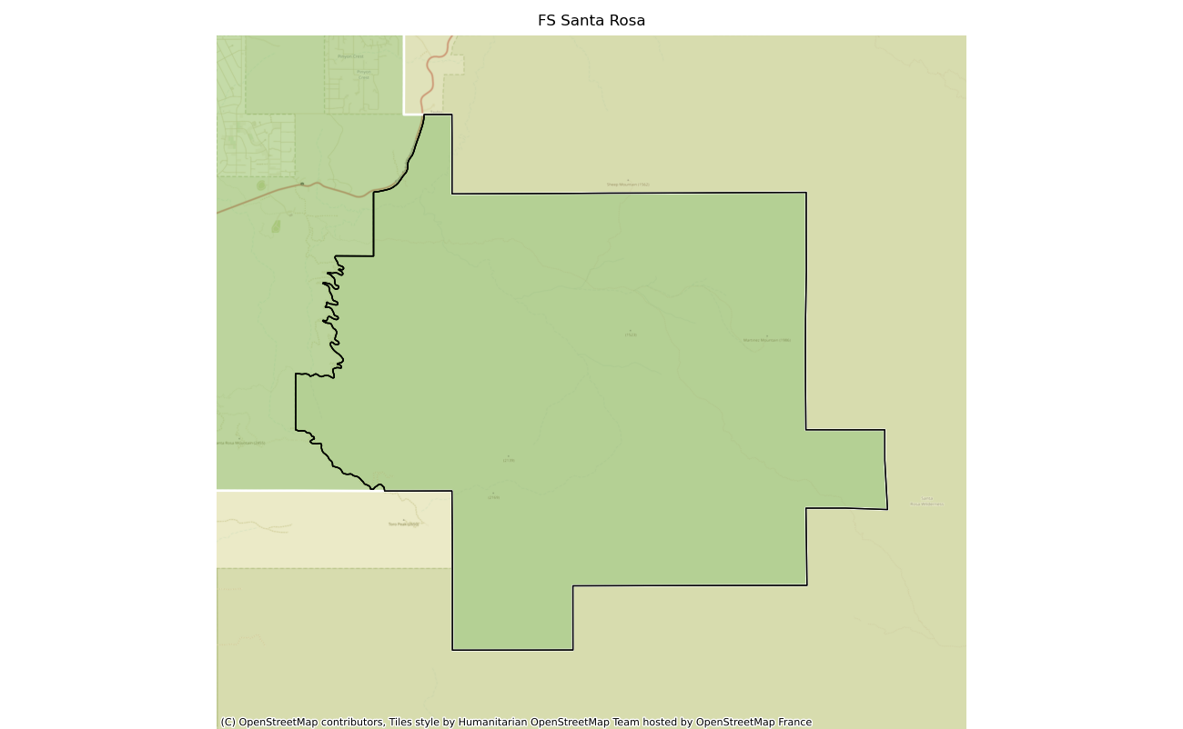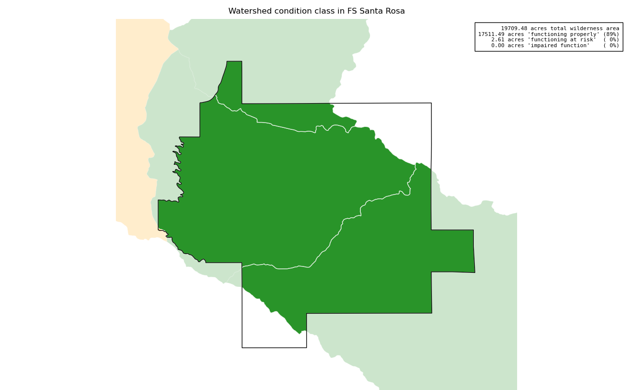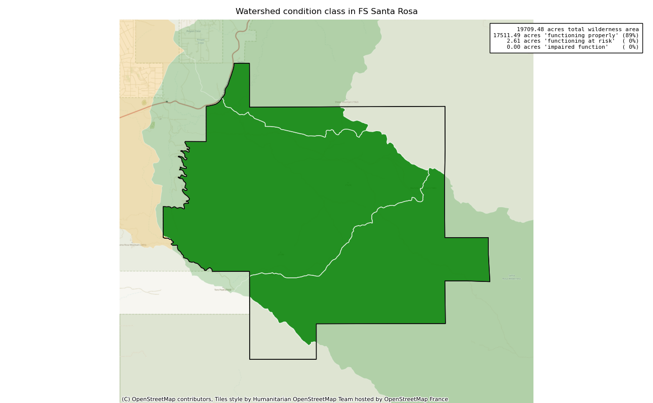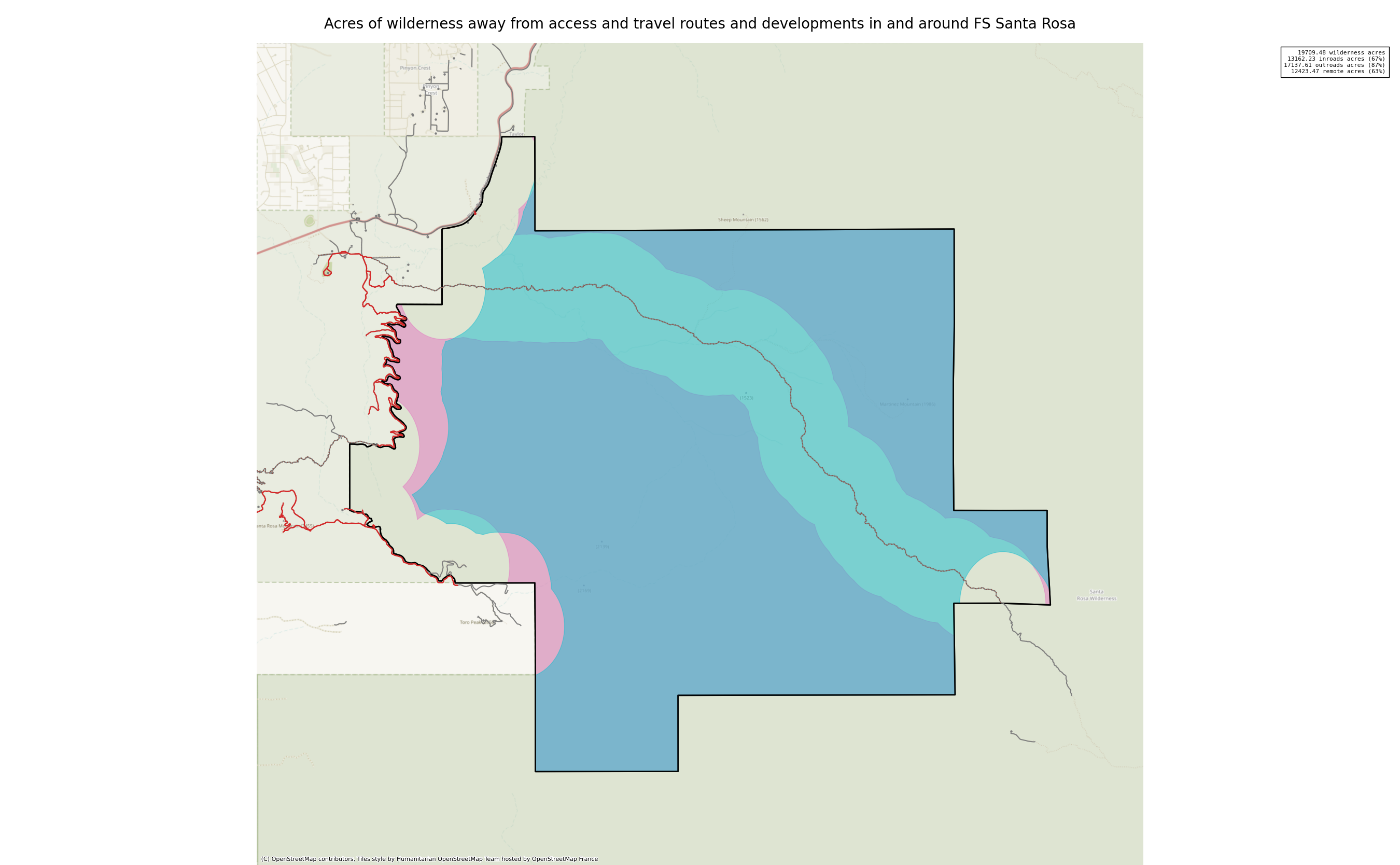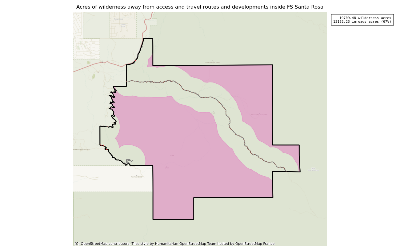 The 19709 acre Santa Rosa was designated as a National Wilderness on or around 1984-01-01, and Wilderness Character Monitoring baseline work was done in 2025. The maps in this section are made with USFS data, with terrain maps from the internet.