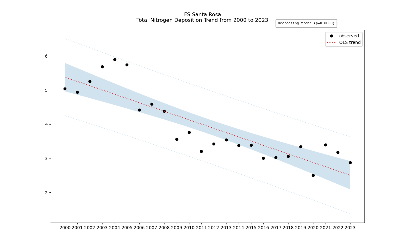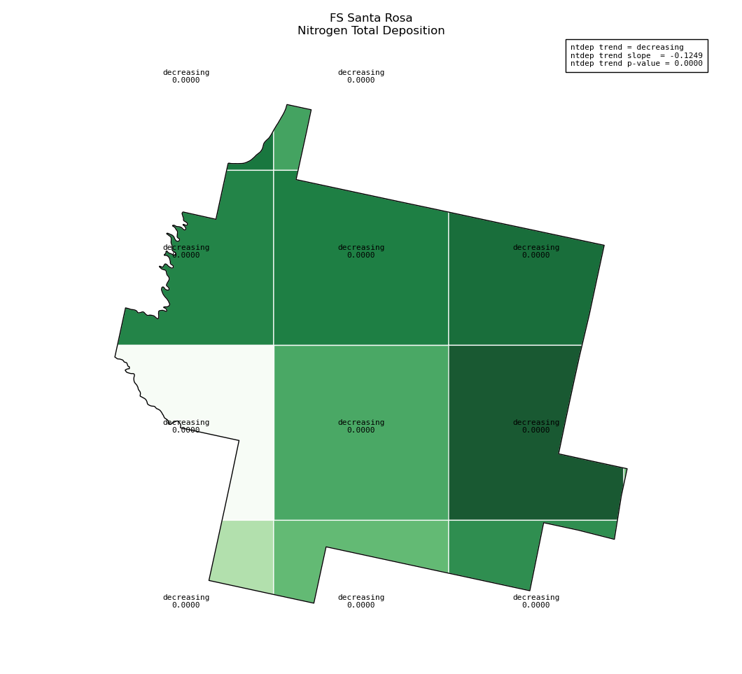 Annual averages for nitrogen total deposition are calculated by clipping the gridded ntdep data to the wilderness boundary, multiplying the total deposition value for each grid cell by its area inside the wilderness, summing ntdep for all cells, then dividing that sum by the total area of the wilderness. These annual averages are then used to determine nitrogen deposition trend inside the wilderness. Decreasing nitrogen deposition indicates an improvement in wilderness character.