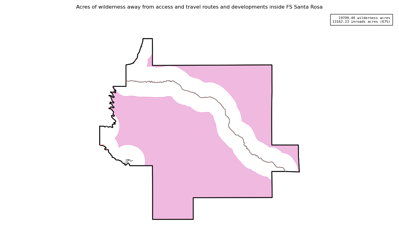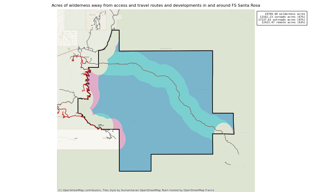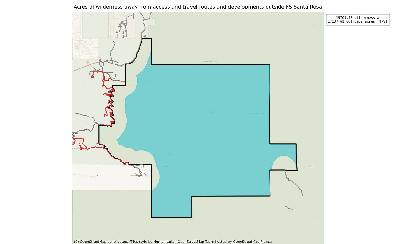 Note that roads and developments located exactly on the wilderness boundary are included in this measure. Spatial data resolution and accuracy can vary greatly across sources, and determining the intersection of a road represented by a single infinitely thin line can produce incorrect results. These should always be verified locally and corrected.