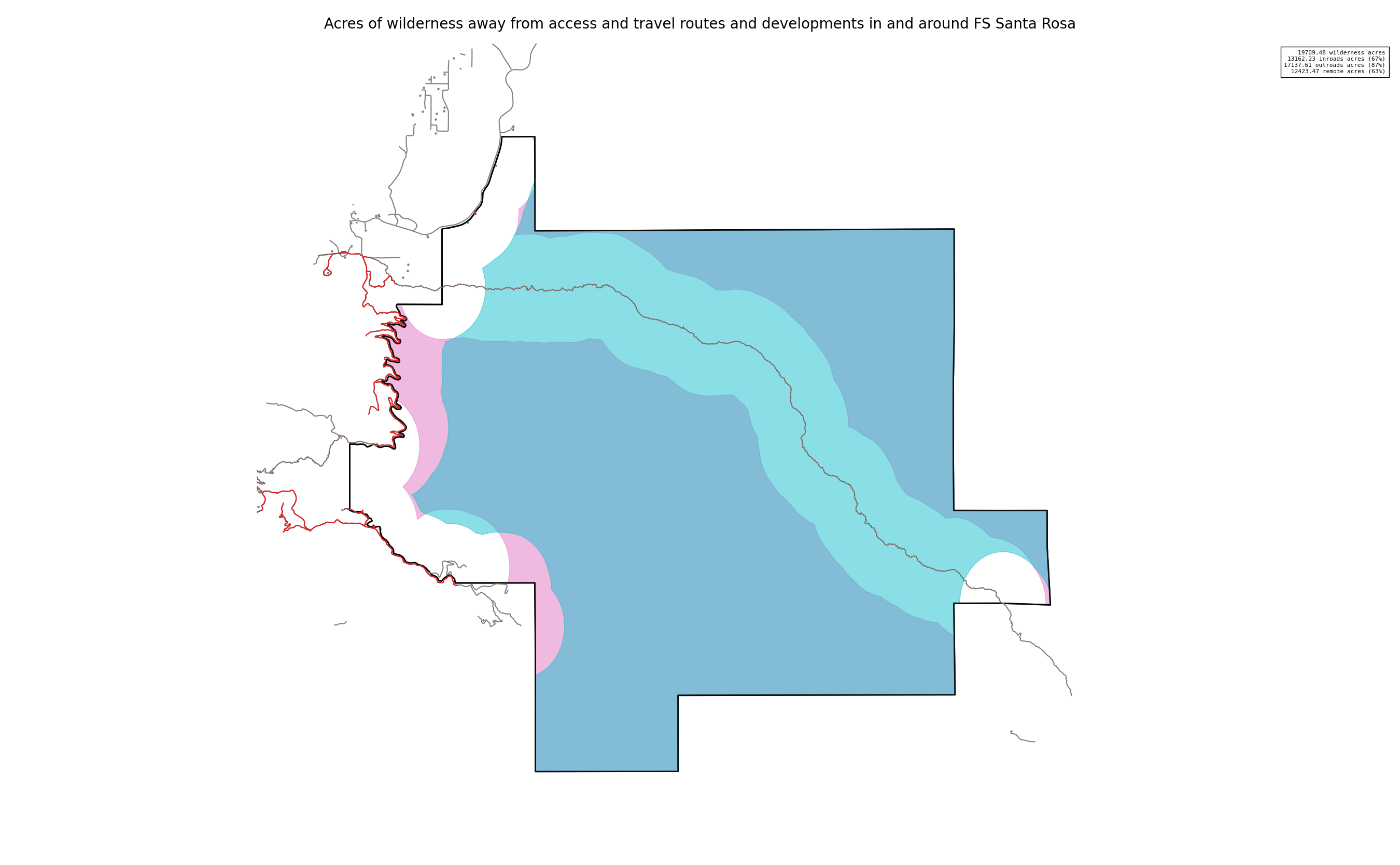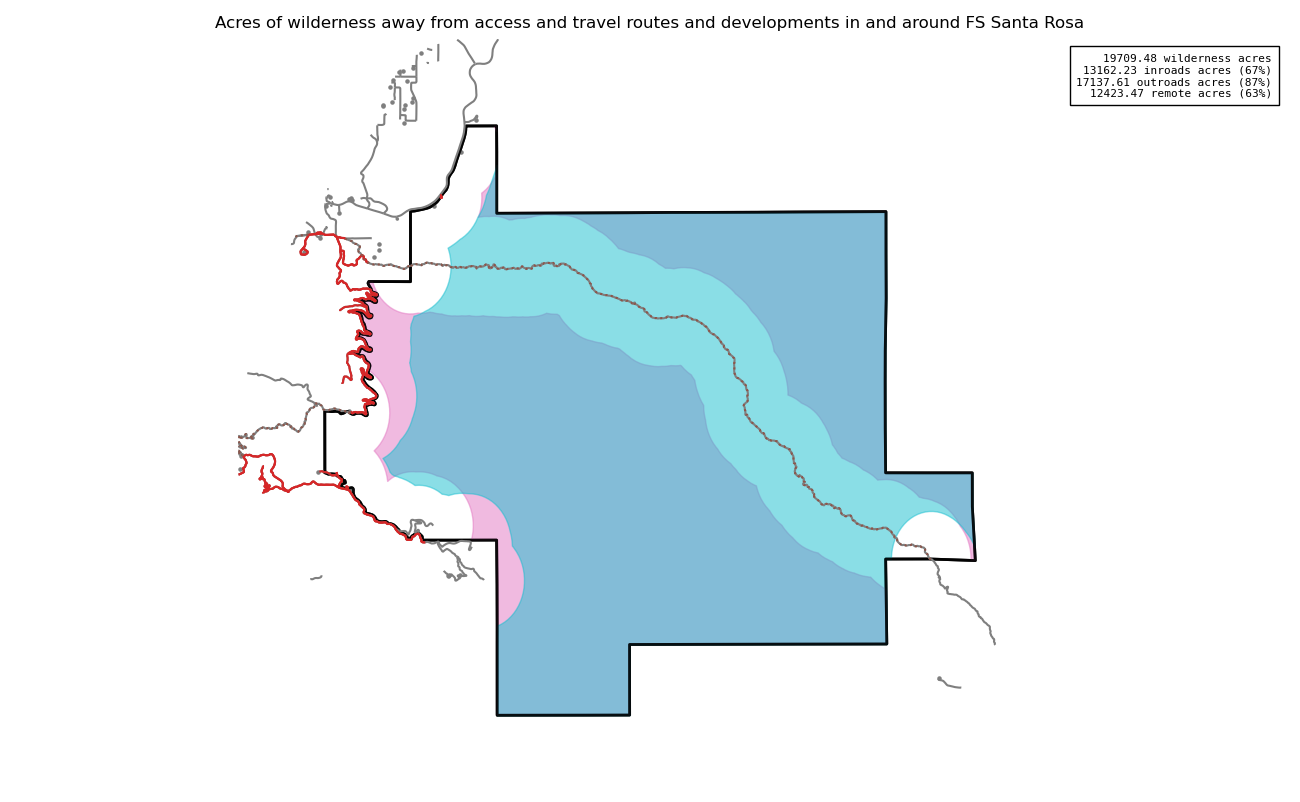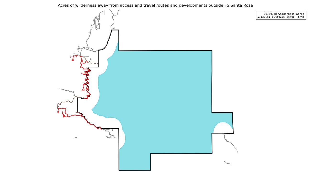 Note that roads and developments located exactly on the wilderness boundary are included in this measure. Spatial data resolution and accuracy can vary greatly across sources, and determining the intersection of a road represented by a single infinitely thin line can produce incorrect results. These should always be verified locally and corrected.