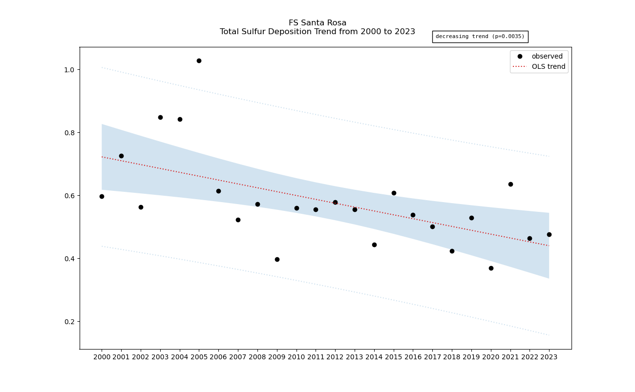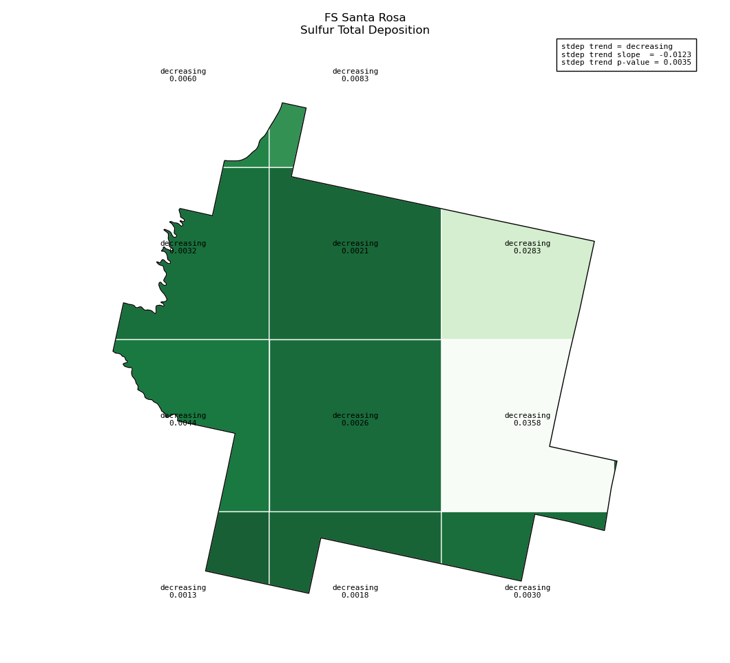 Annual averages for sulfur total deposition are calculated by clipping the gridded stdep data to the wilderness boundary, multiplying the total deposition value for each grid cell by its area inside the wilderness, summing stdep for all cells, then dividing that sum by the total area of the wilderness. These annual averages are then used to determine sulfur deposition trend inside the wilderness. Decreasing sulfur deposition indicates an improvement in wilderness character.