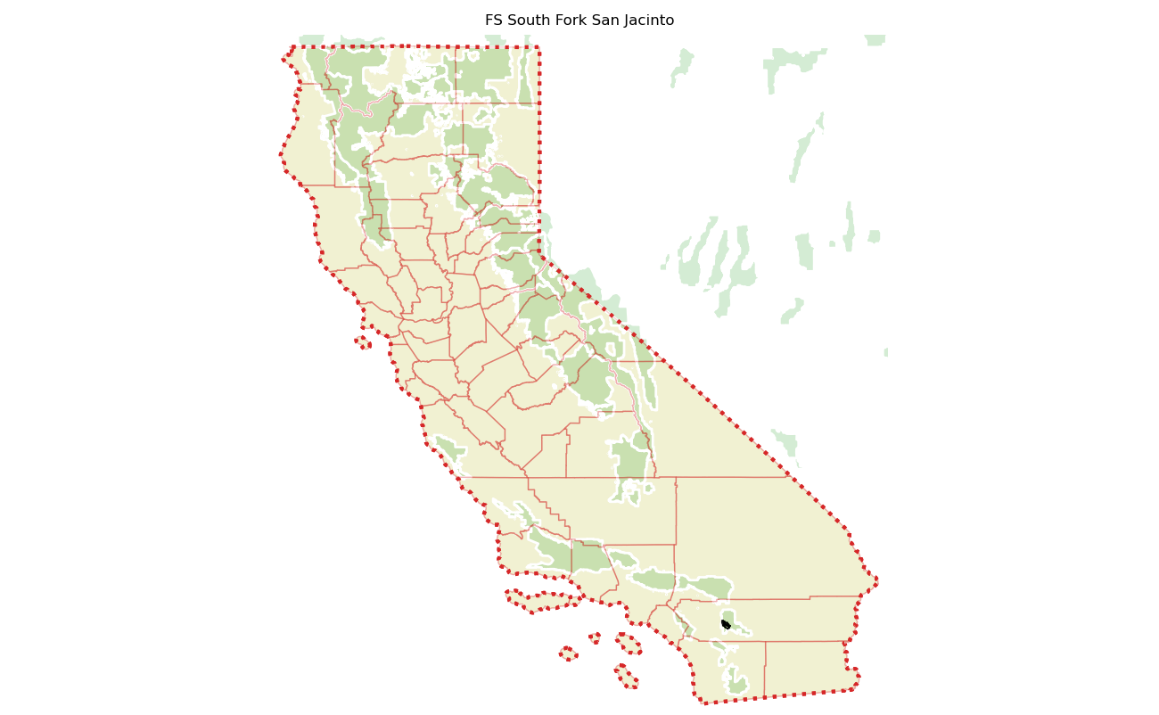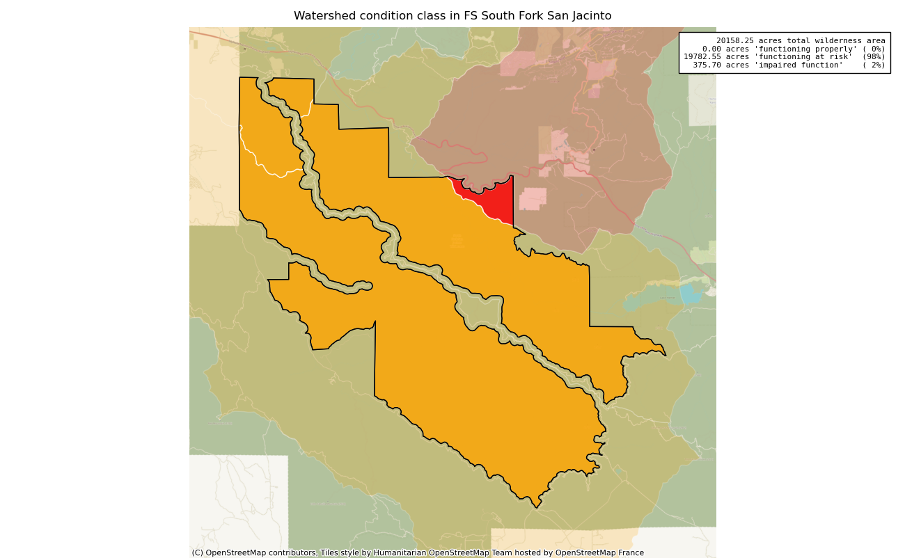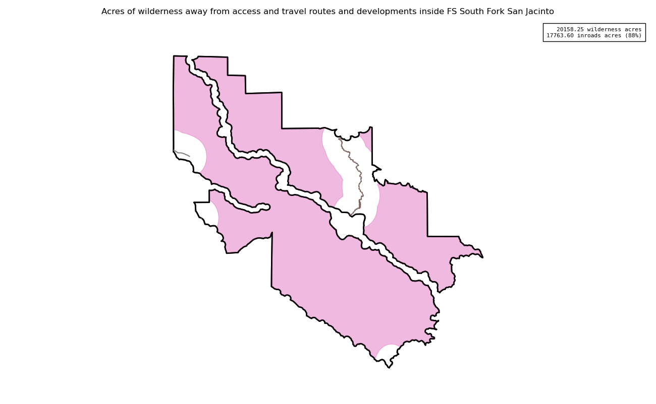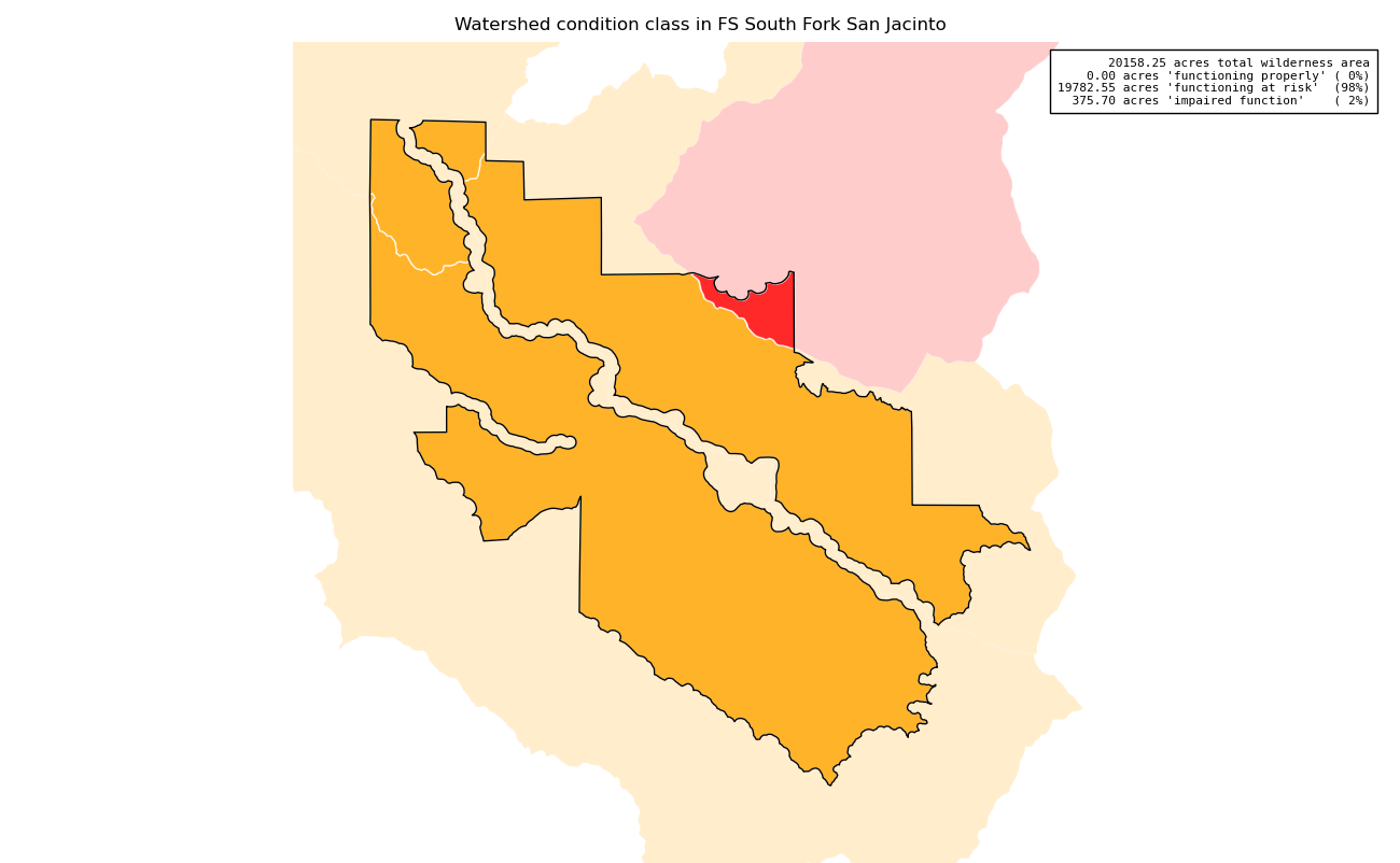 The 20158 acre South Fork San Jacinto was designated as a National Wilderness on or around 2009-01-01, and Wilderness Character Monitoring baseline work was done in 2025. The maps in this section are made with USFS data, with terrain maps from the internet.