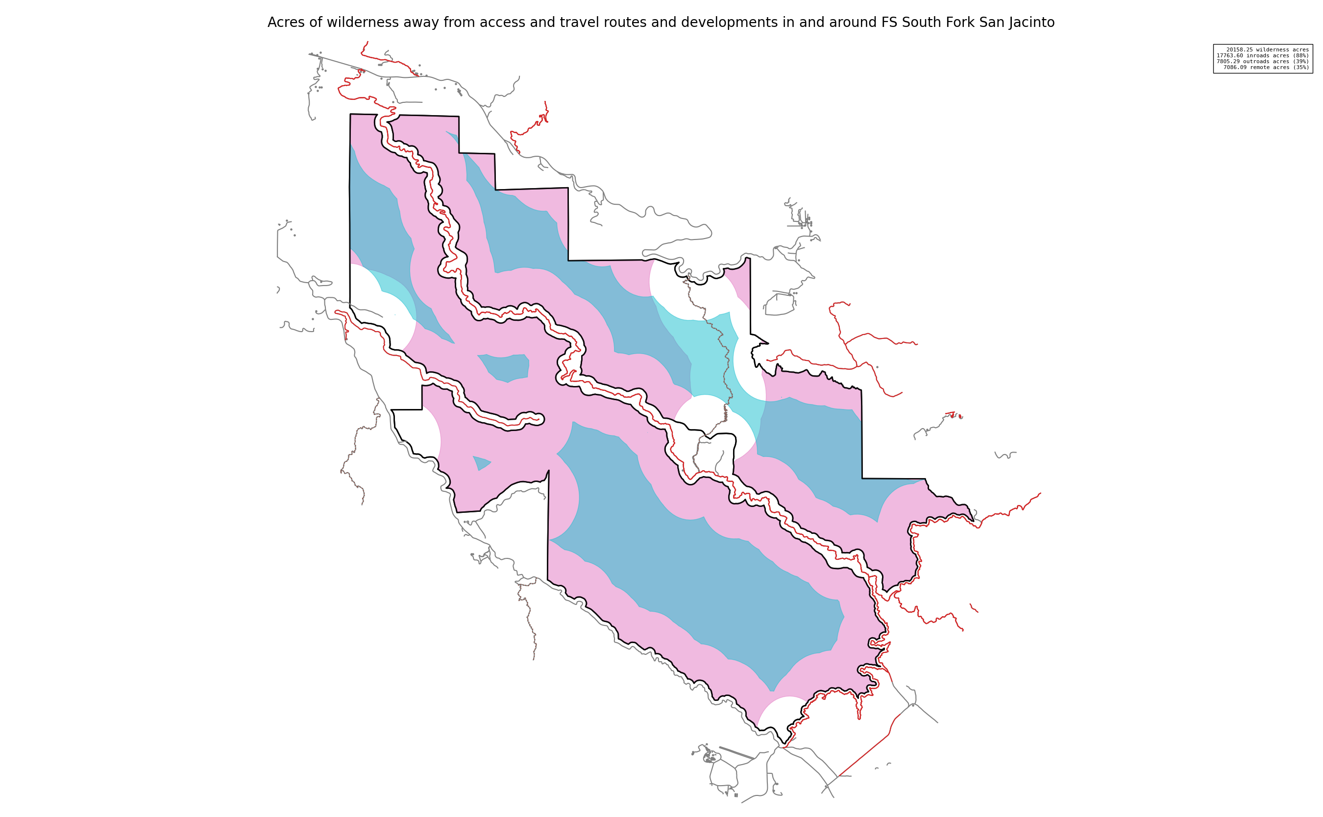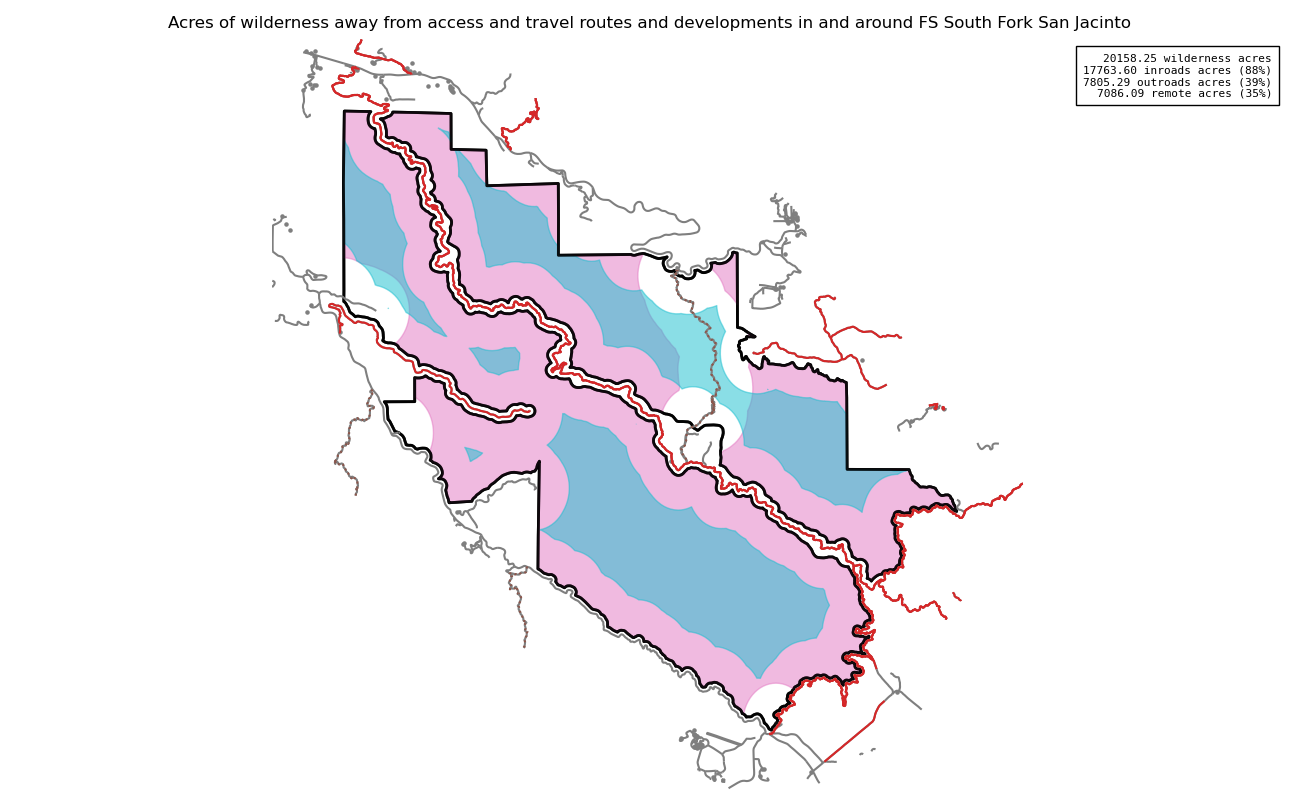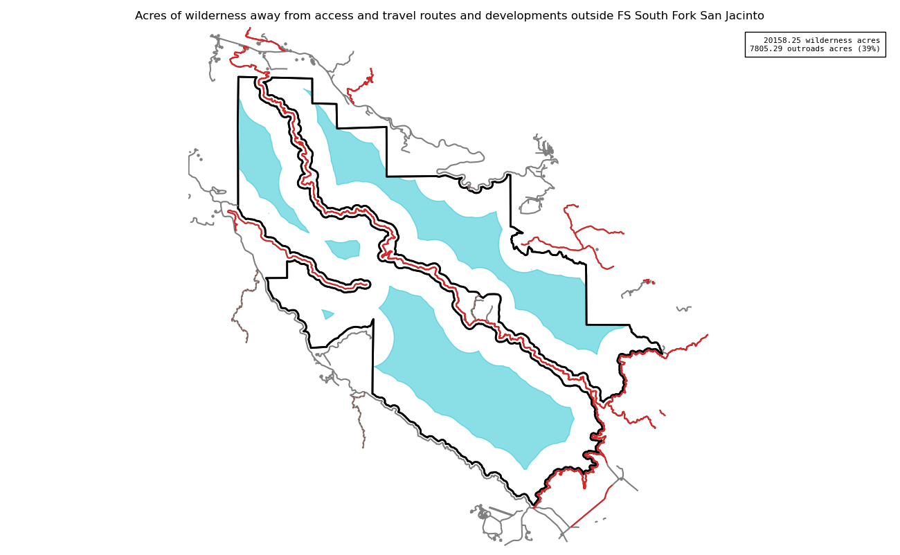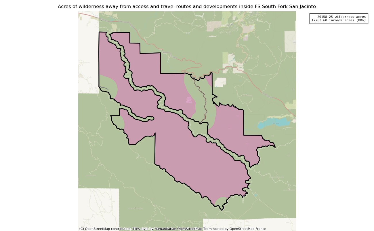 The 20158 acre South Fork San Jacinto was designated as a National Wilderness on or around 2009-01-01, and Wilderness Character Monitoring baseline work was done in 2025. The maps in this section are made with USFS data, with terrain maps from the internet.