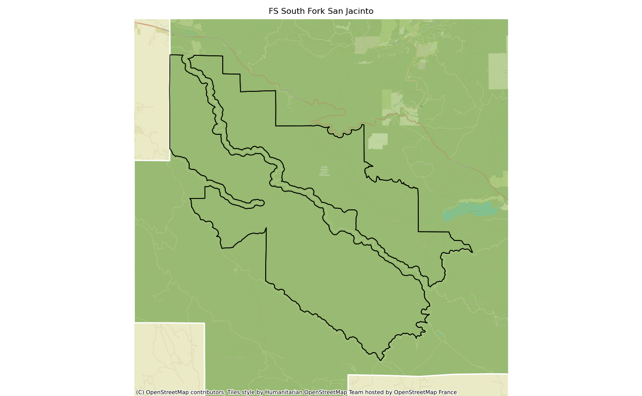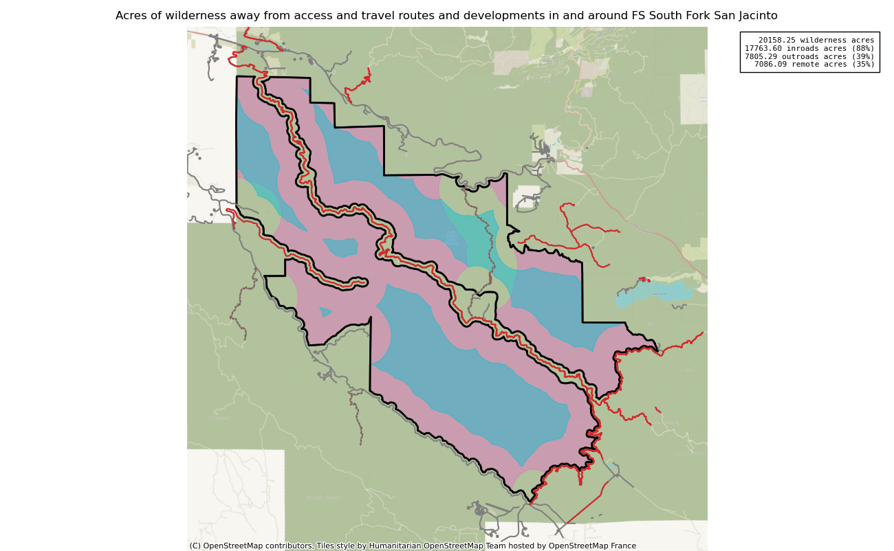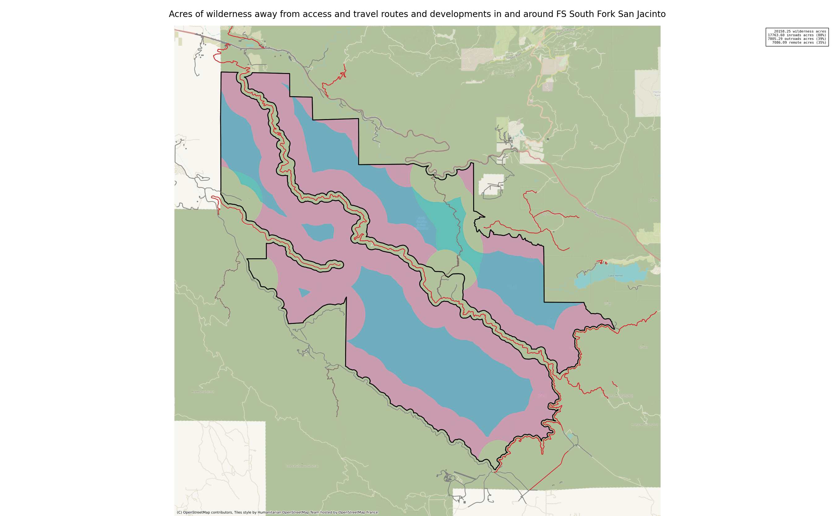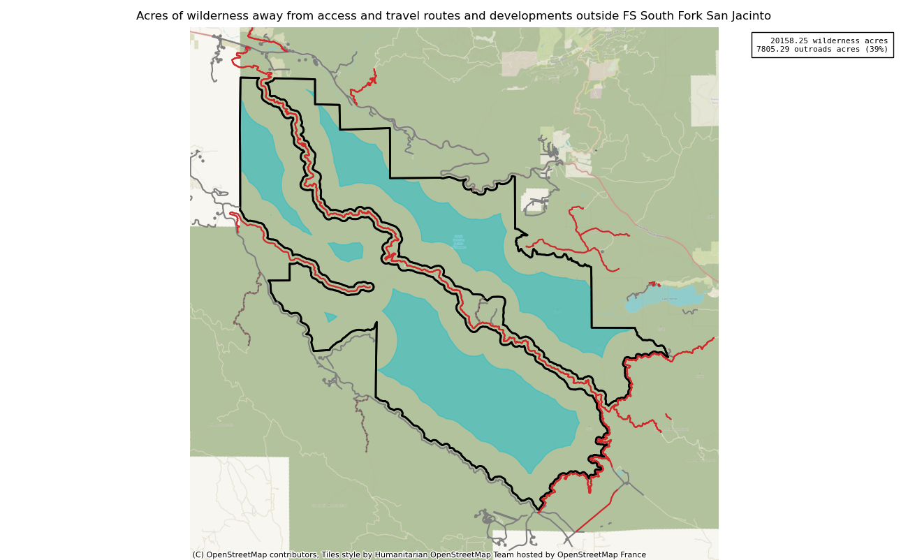 The 20158 acre South Fork San Jacinto was designated as a National Wilderness on or around 2009-01-01, and Wilderness Character Monitoring baseline work was done in 2025. The maps in this section are made with USFS data, with terrain maps from the internet.