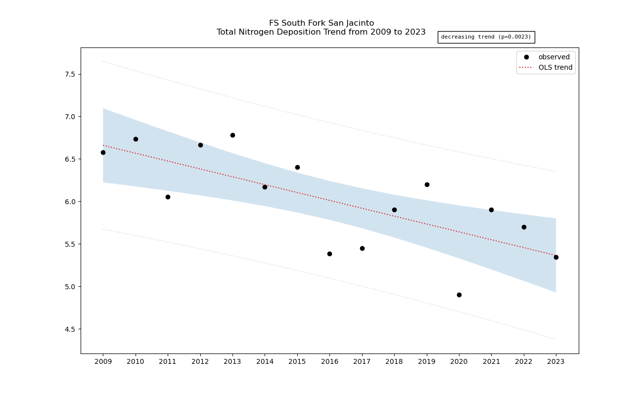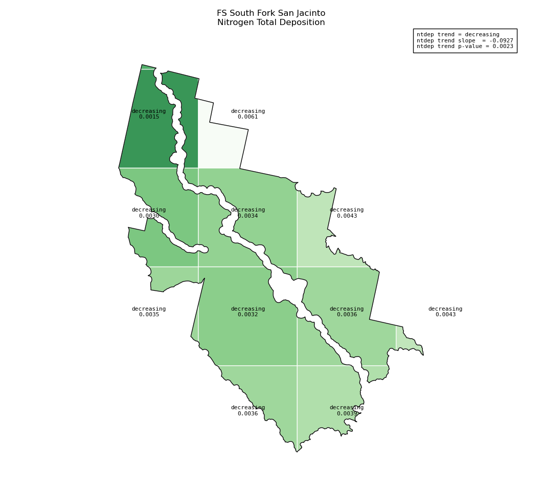 Annual averages for nitrogen total deposition are calculated by clipping the gridded ntdep data to the wilderness boundary, multiplying the total deposition value for each grid cell by its area inside the wilderness, summing ntdep for all cells, then dividing that sum by the total area of the wilderness. These annual averages are then used to determine nitrogen deposition trend inside the wilderness. Decreasing nitrogen deposition indicates an improvement in wilderness character.