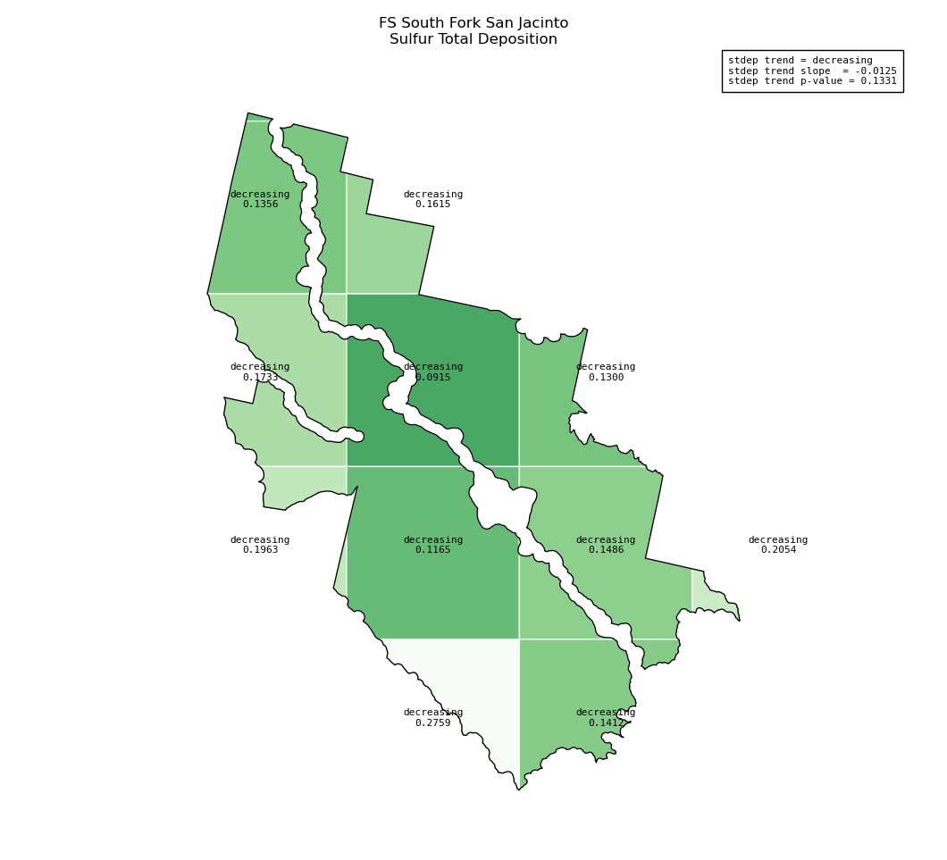 Annual averages for sulfur total deposition are calculated by clipping the gridded stdep data to the wilderness boundary, multiplying the total deposition value for each grid cell by its area inside the wilderness, summing stdep for all cells, then dividing that sum by the total area of the wilderness. These annual averages are then used to determine sulfur deposition trend inside the wilderness. Decreasing sulfur deposition indicates an improvement in wilderness character.