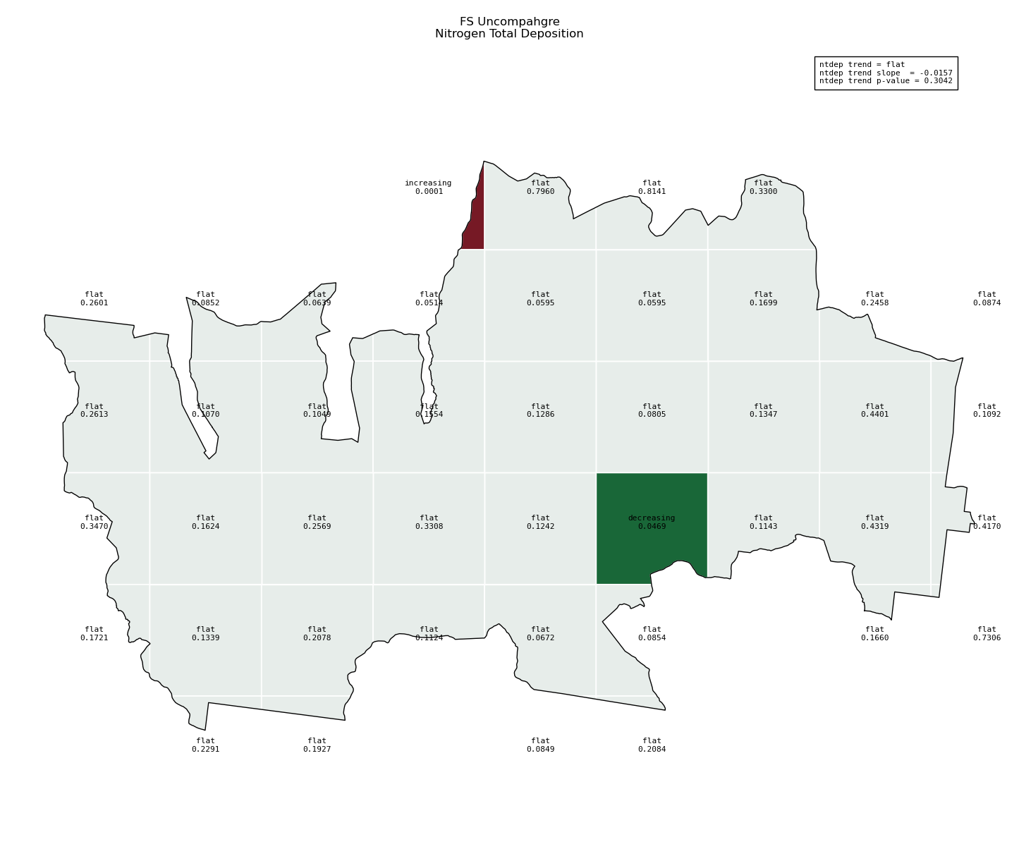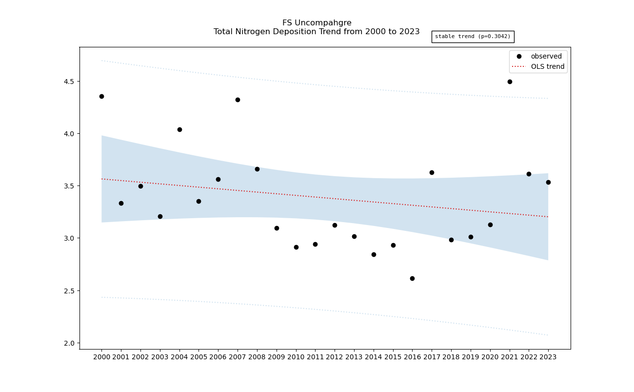 Annual averages for nitrogen total deposition are calculated by clipping the gridded ntdep data to the wilderness boundary, multiplying the total deposition value for each grid cell by its area inside the wilderness, summing ntdep for all cells, then dividing that sum by the total area of the wilderness. These annual averages are then used to determine nitrogen deposition trend inside the wilderness. Decreasing nitrogen deposition indicates an improvement in wilderness character.