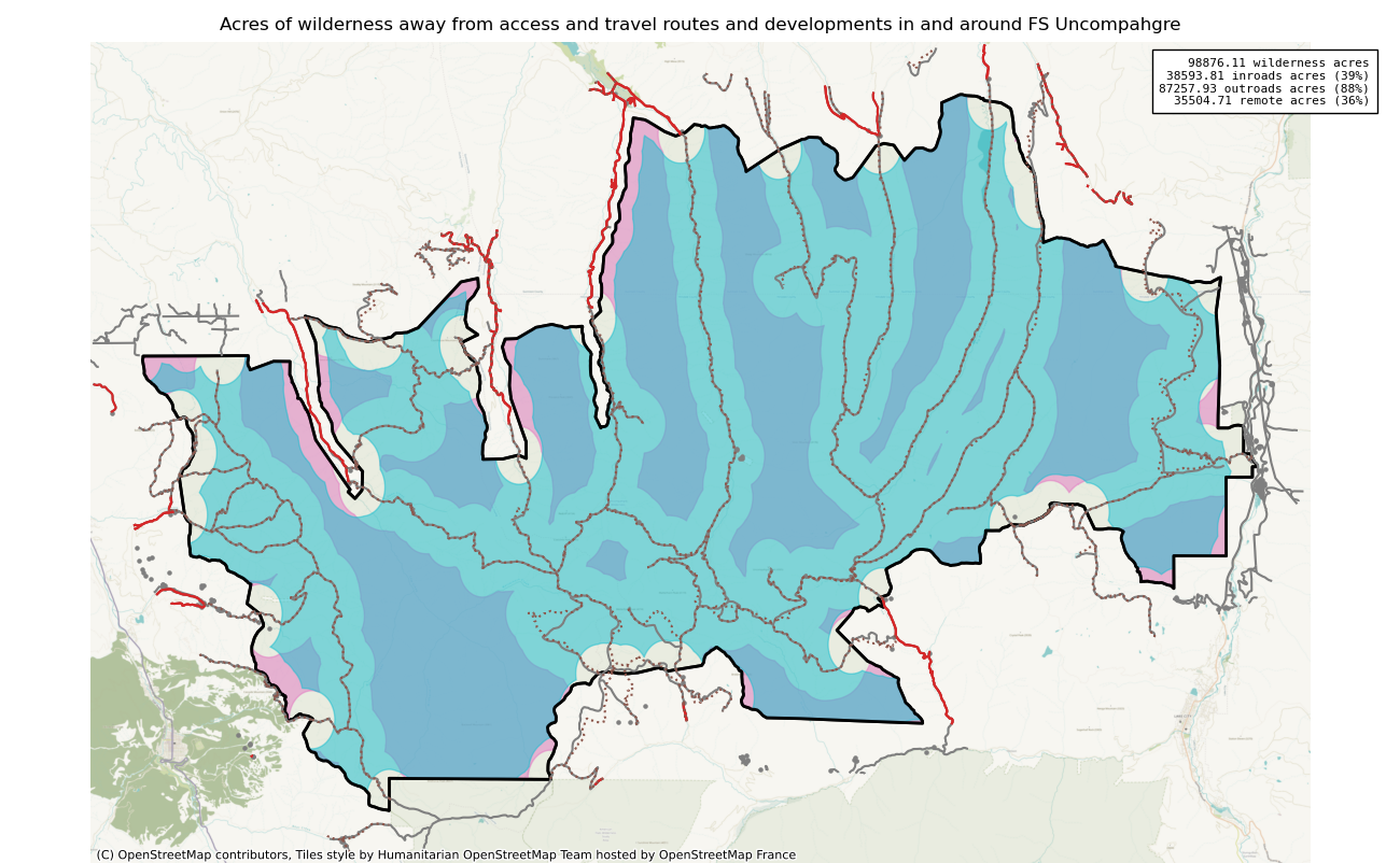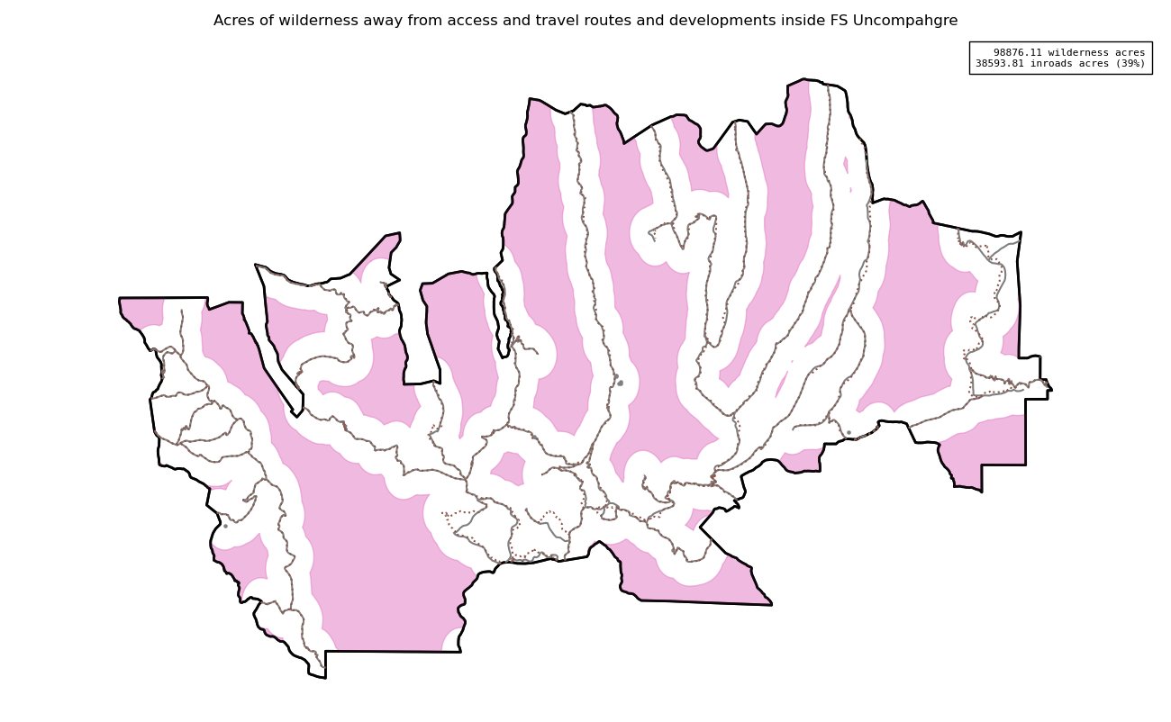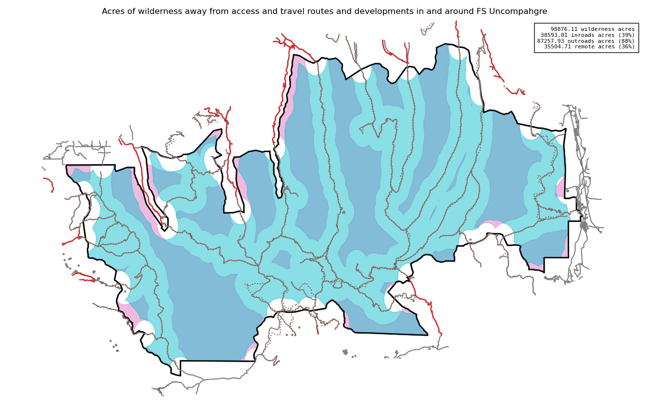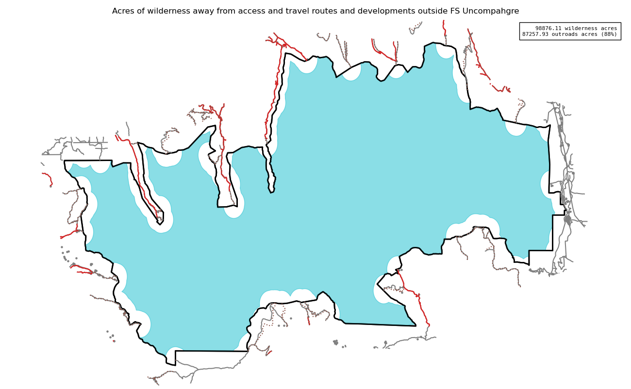 Note that roads and developments located exactly on the wilderness boundary are included in this measure. Spatial data resolution and accuracy can vary greatly across sources, and determining the intersection of a road represented by a single infinitely thin line can produce incorrect results. These should always be verified locally and corrected.