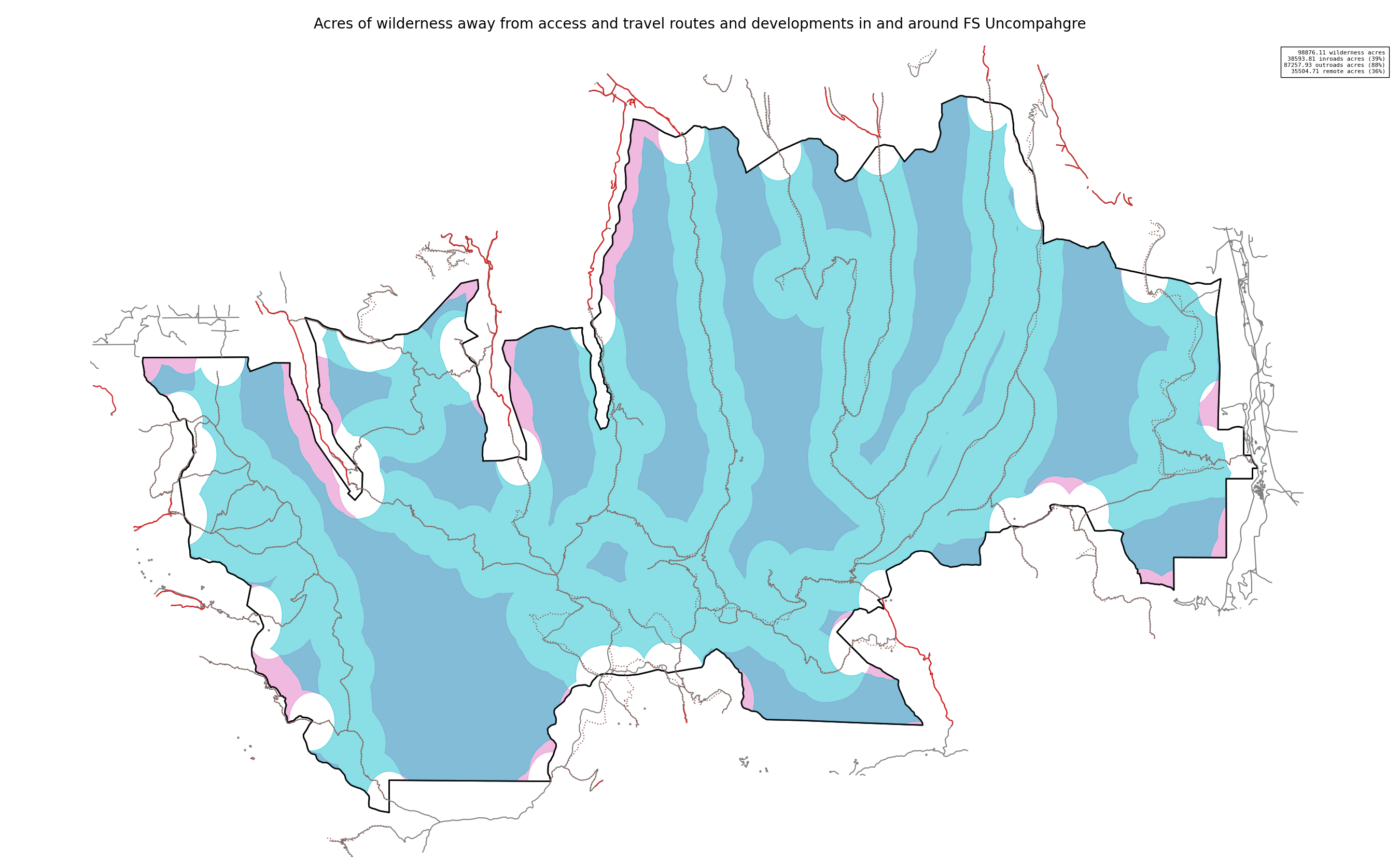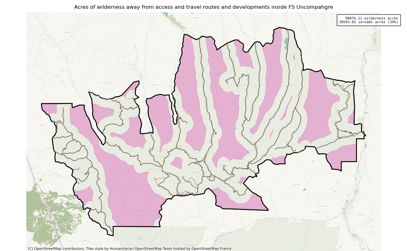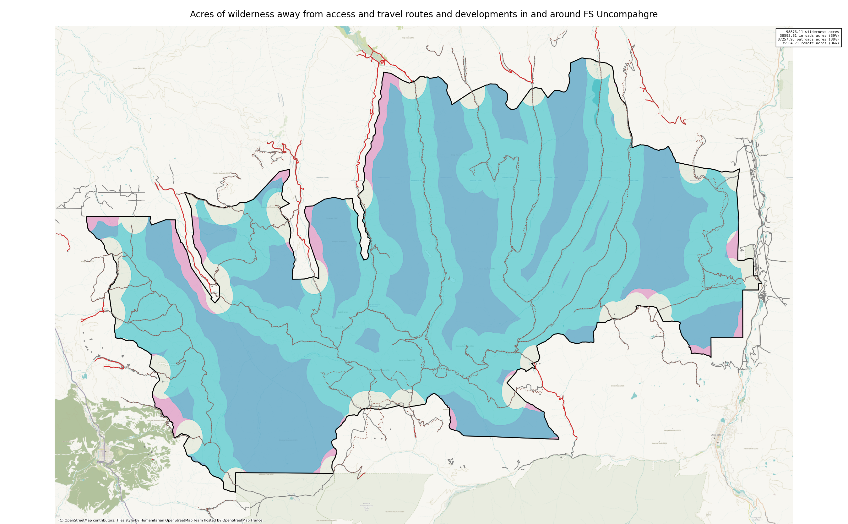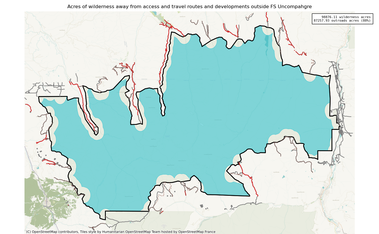 Note that roads and developments located exactly on the wilderness boundary are included in this measure. Spatial data resolution and accuracy can vary greatly across sources, and determining the intersection of a road represented by a single infinitely thin line can produce incorrect results. These should always be verified locally and corrected.