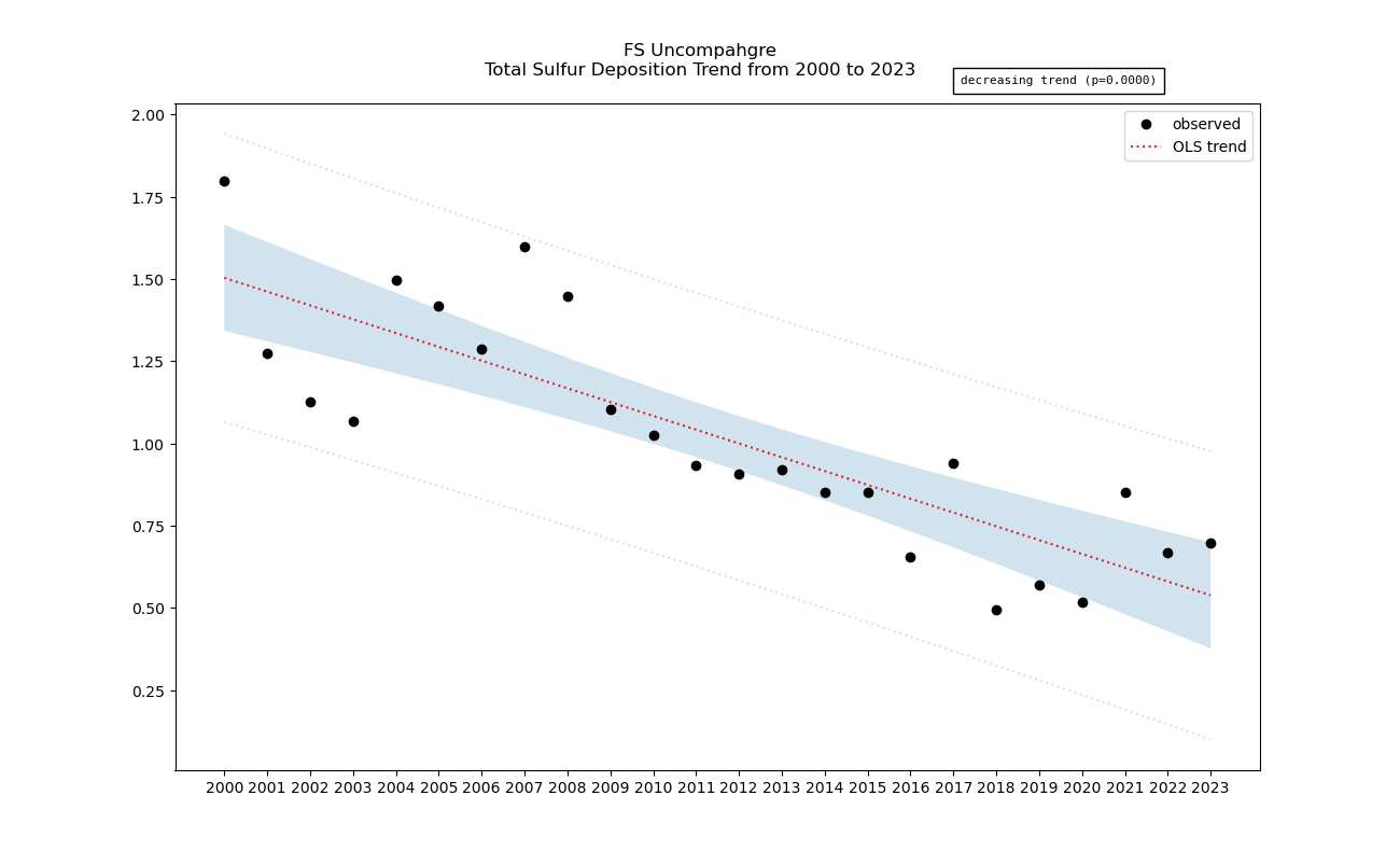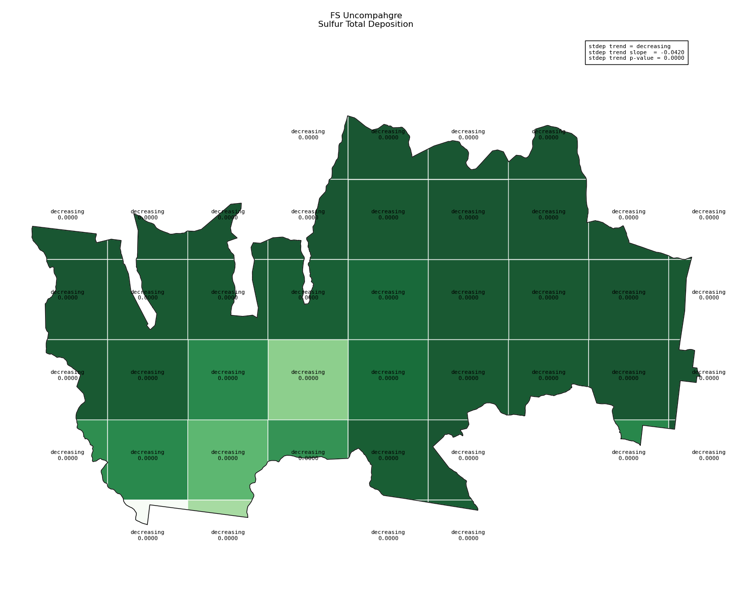 Annual averages for sulfur total deposition are calculated by clipping the gridded stdep data to the wilderness boundary, multiplying the total deposition value for each grid cell by its area inside the wilderness, summing stdep for all cells, then dividing that sum by the total area of the wilderness. These annual averages are then used to determine sulfur deposition trend inside the wilderness. Decreasing sulfur deposition indicates an improvement in wilderness character.