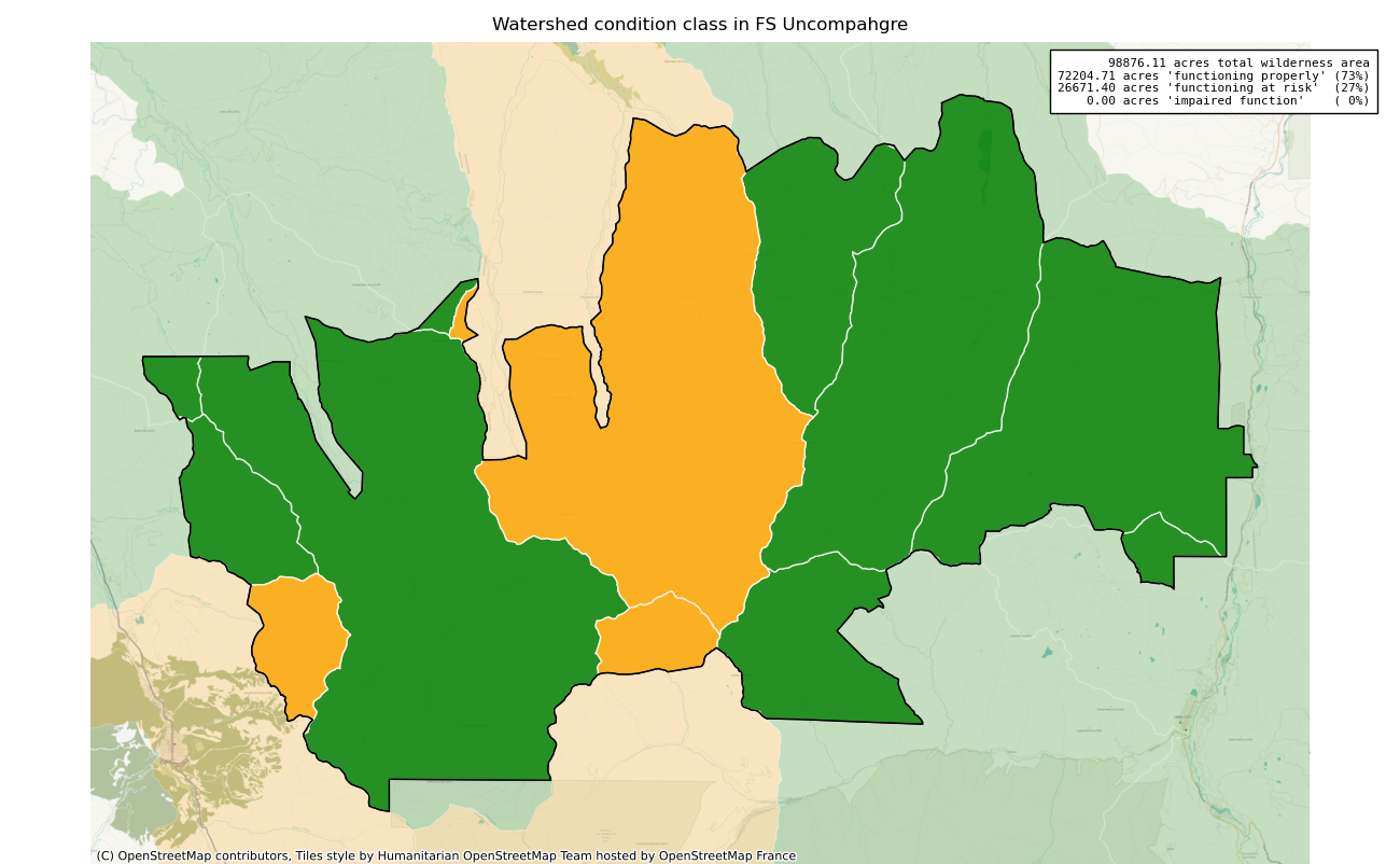 The 98876 acre Uncompahgre was designated as a National Wilderness on or around 1980-01-01, and Wilderness Character Monitoring baseline work was done in 2025. The maps in this section are made with USFS data, with terrain maps from the internet.