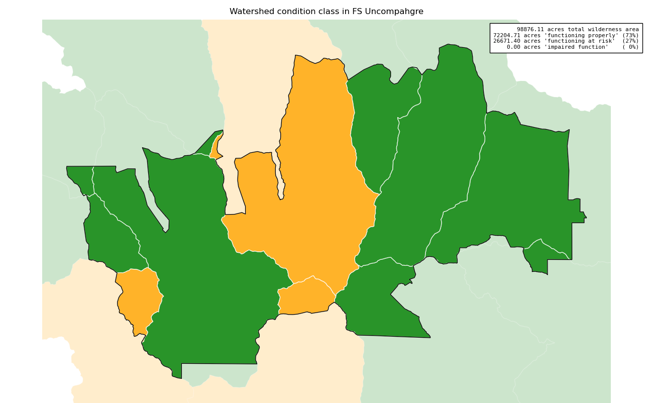 The Watershed Condition Class measure is intended to monitor changes in the watershed functions supporting aquatic ecosystems inside the wilderness. USFS Watershed Condition Class is derived from 12 different indicators -- water quality, water quantity, aquatic habitat, aquatic biota, roads and trails, soils, riparian/wetland vegetation, fire regime or wildfire, forest cover, rangeland vegetation, terrestrial invasive species, and forest health -- resulting in a single score describing watershed integrity for each watershed:
