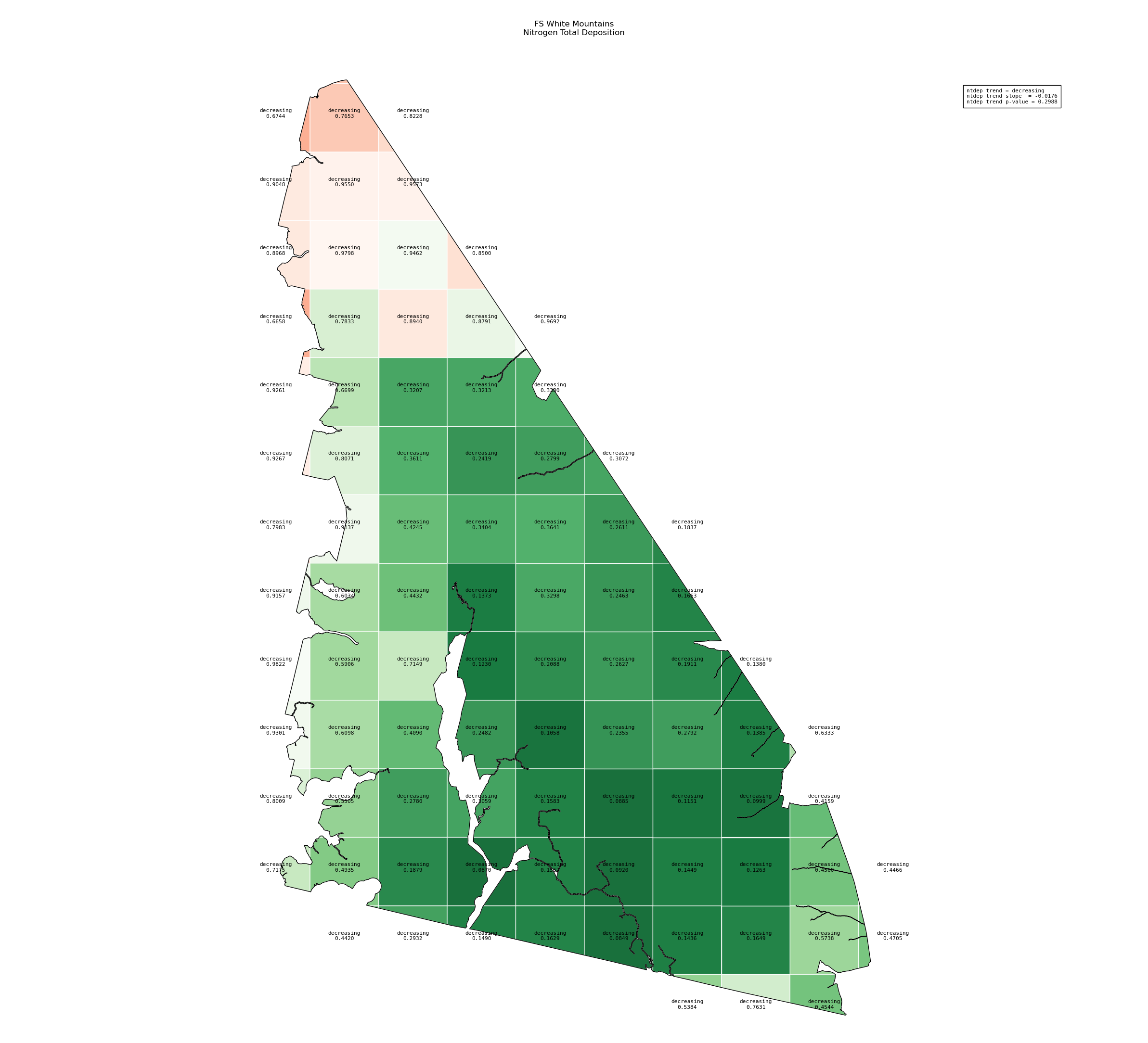 Annual averages for nitrogen total deposition are calculated by clipping the gridded ntdep data to the wilderness boundary, multiplying the total deposition value for each grid cell by its area inside the wilderness, summing ntdep for all cells, then dividing that sum by the total area of the wilderness. These annual averages are then used to determine nitrogen deposition trend inside the wilderness. Decreasing nitrogen deposition indicates an improvement in wilderness character.
