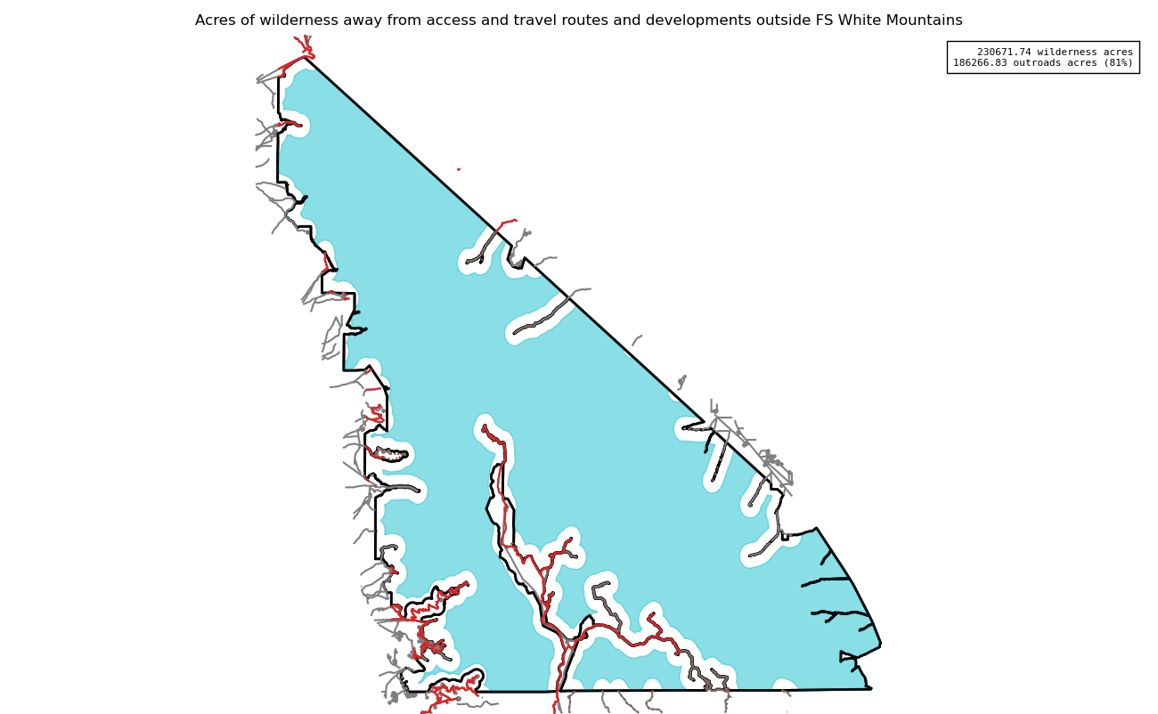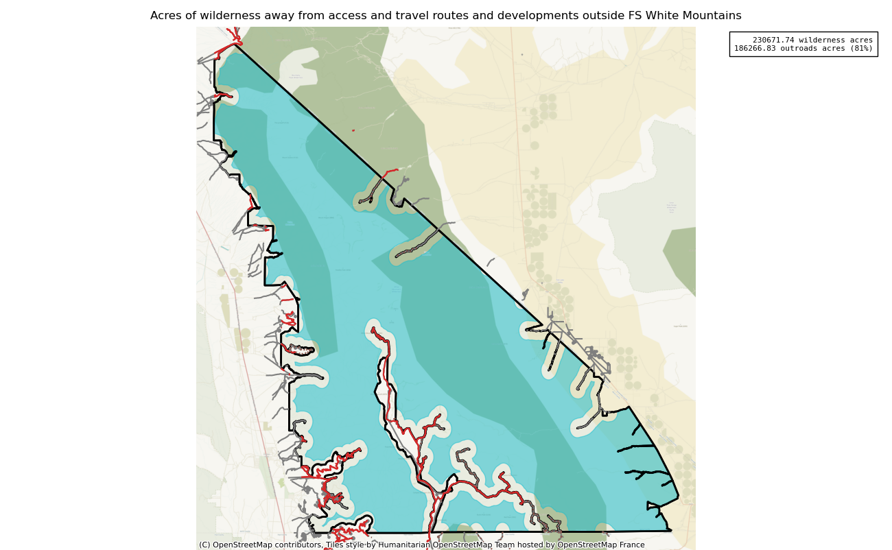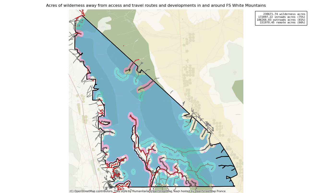 Note that roads and developments located exactly on the wilderness boundary are included in this measure. Spatial data resolution and accuracy can vary greatly across sources, and determining the intersection of a road represented by a single infinitely thin line can produce incorrect results. These should always be verified locally and corrected.
