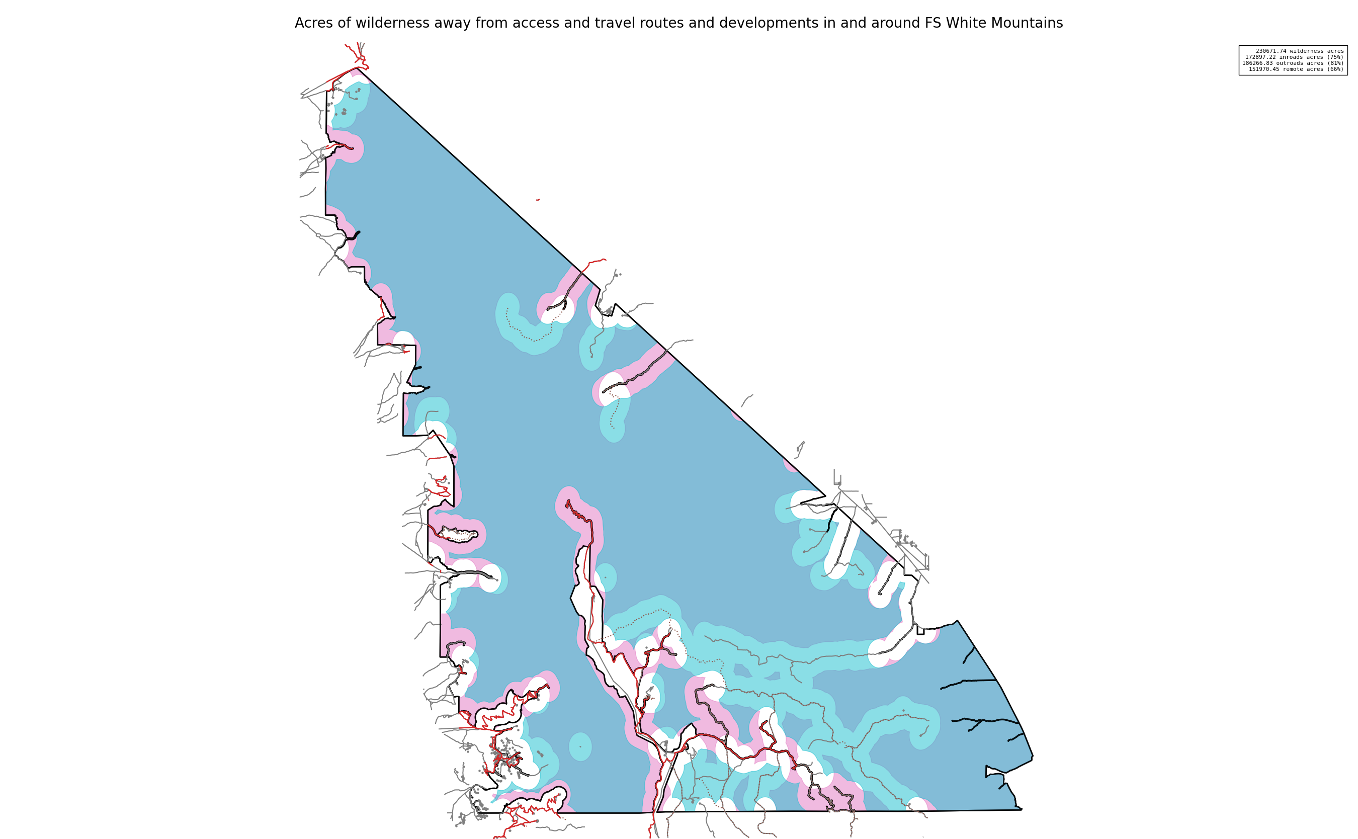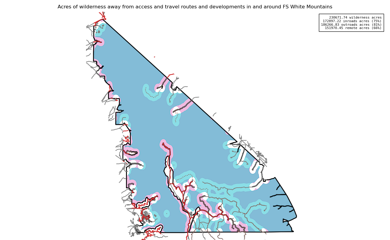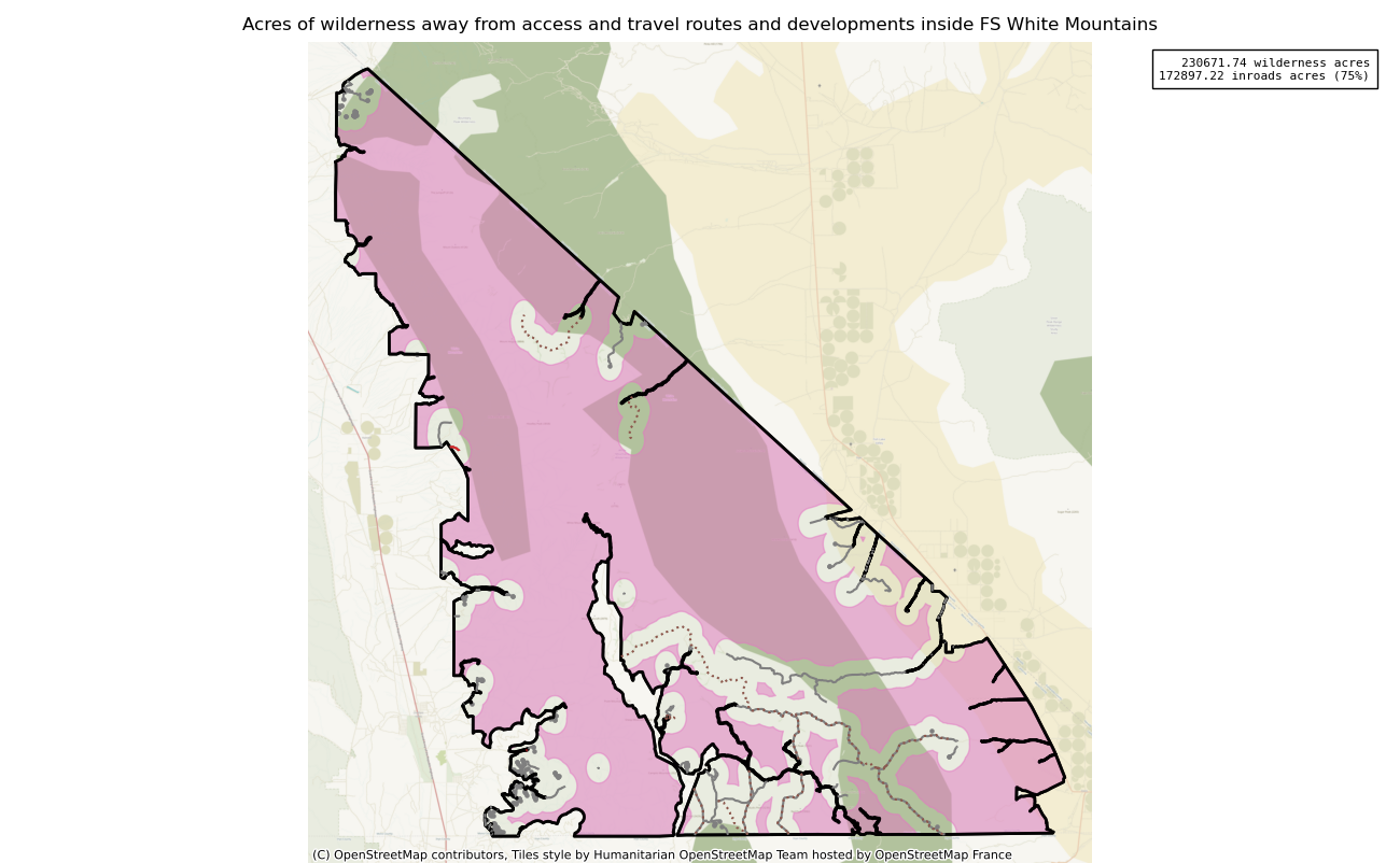 Note that roads and developments located exactly on the wilderness boundary are included in this measure. Spatial data resolution and accuracy can vary greatly across sources, and determining the intersection of a road represented by a single infinitely thin line can produce incorrect results. These should always be verified locally and corrected.