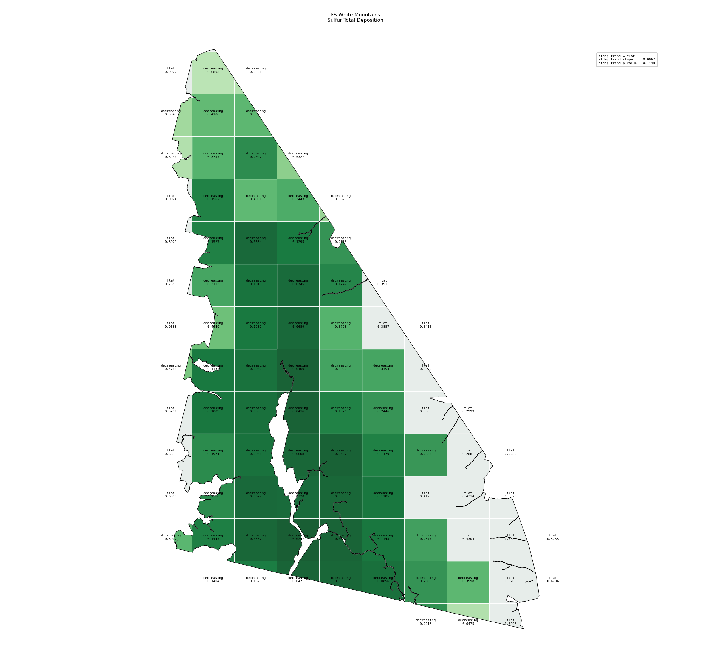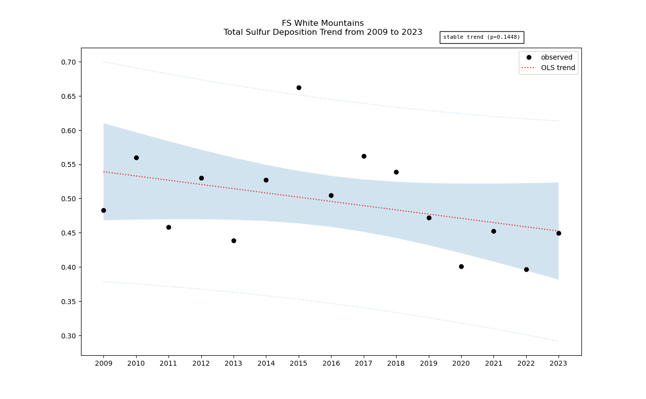 Annual averages for sulfur total deposition are calculated by clipping the gridded stdep data to the wilderness boundary, multiplying the total deposition value for each grid cell by its area inside the wilderness, summing stdep for all cells, then dividing that sum by the total area of the wilderness. These annual averages are then used to determine sulfur deposition trend inside the wilderness. Decreasing sulfur deposition indicates an improvement in wilderness character.