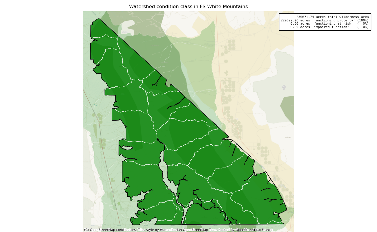 The Watershed Condition Class measure is intended to monitor changes in the watershed functions supporting aquatic ecosystems inside the wilderness. USFS Watershed Condition Class is derived from 12 different indicators -- water quality, water quantity, aquatic habitat, aquatic biota, roads and trails, soils, riparian/wetland vegetation, fire regime or wildfire, forest cover, rangeland vegetation, terrestrial invasive species, and forest health -- resulting in a single score describing watershed integrity for each watershed: